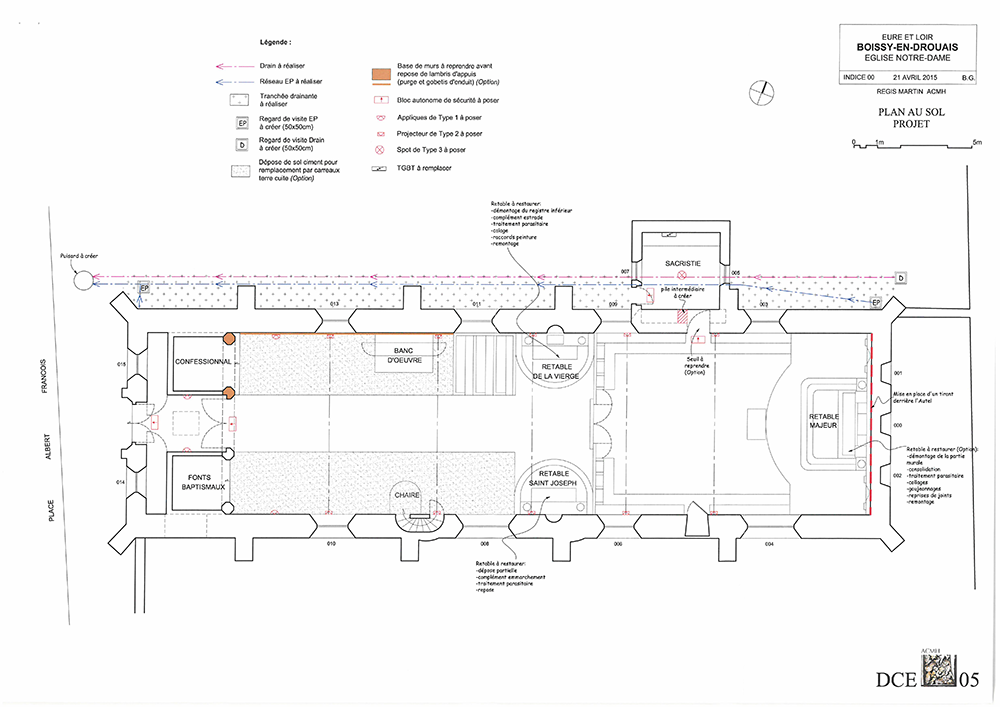 La commune de Boissy-en-Drouais est située à l’ouest de Dreux. L’église paroissiale, dédiée à la Vierge, est implantée au centre du village et semble appartenir à la campagne de reconstruction postérieure à la guerre de Cent Ans. Le plan de l’édifice est constitué d’une nef de quatre travées, dont la première reçoit le clocher. Le chœur est quant à lui rythmé par deux travées droites et un chevet plat, à trois lancettes, dissimulé par le retable du maître-autel principal. Une sacristie a été greffée, en 1731, sur le côté nord, en accès direct avec le chœur.
