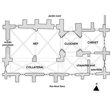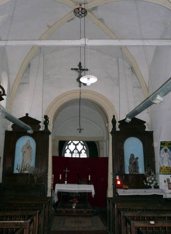 La nef, de deux travées, pourvue d’un unique bas-côté au sud, n’est pas antérieure à l’extrême fin du Moyen Âge, comme en témoignent les remplages flamboyants des baies. Elle a été reprise à une date tardive : une clef de voûte du collatéral porte la date de 1706. La façade est un simple mur-pignon épaulé aux extrémités par deux contreforts couronnés en bâtière. Sous deux petites baies géminées, le portail, coiffé d’un gâble plein, a été repris à l’époque classique.