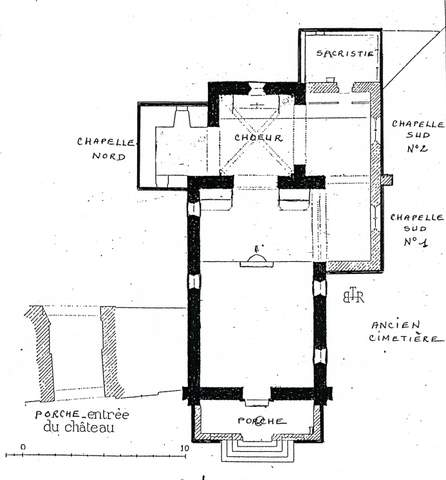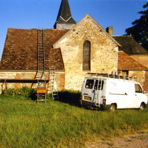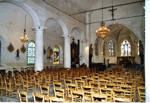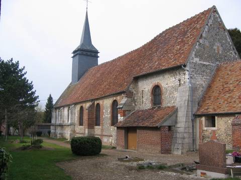 Le chœur doit remonter au XIIIe s., comme l’indiquent le profil des ogives à deux tores séparés par un onglet, les quatre têtes humaines placées à l’intersection des arcs contre la clef de voûte et l’arc triomphal mouluré d’un bandeau précédé d’un tore vers la nef. Celle-ci, éclairée par de modestes baies en plein cintre, est maintenant couverte d’un plafond à voussure moderne ; ses baies en plein cintre ont été refaites, mais la présence sur le mur-pignon de contreforts faiblement saillants permet d’en faire remonter la construction à l’époque romane. La chapelle sud est une construction soignée remontant sans doute au XVIe s., comme l’indiquent l’appareil échiqueté de silex et de briques et les remplages flamboyants des baies à deux lancettes qui ont toutefois pu être refaits ultérieurement. Deux arcades à pénétration directe dans les maçonneries ouvrent sur le vaisseau principal de l’église. Un arc doubleau pareillement mouluré sépare les deux travées de la chapelle couvertes d’un lambris.