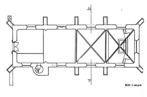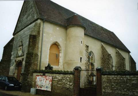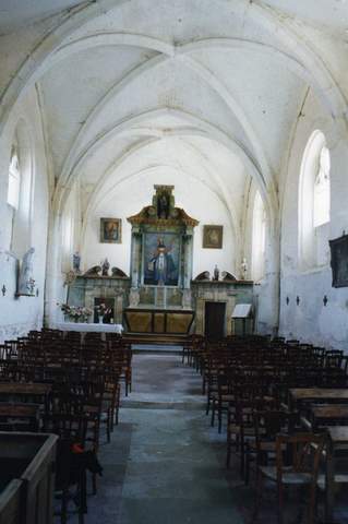 Les deux travées orientales voûtées sur croisées d’ogives forment le chœur: le profil prismatique des ogives, les piliers circulaires engagés, dans lesquels elles pénètrent sans l’intermédiaire de chapiteaux ; et le remplage des fenêtres correspondent bien à l’époque flamboyante, entre la fin du XVe s. et le début du XVIème siècle. Les deux premières travées n’ont pas été voûtées, bien que le départ des nervures prouve que ce voûtement était prévu. Elles sont simplement recouvertes d’un plafond en bois. Les baies divisées en deux lancettes en plein cintre surmontées d’un oculus montrent que l’édifice a été achevé plus tard au cours du XVIème siècle. Accolée à la première travée côté sud, une tourelle semi-circulaire contient l’escalier d’accès aux combles et au cloche qui jusqu’au siècle dernier surmontait la toiture.