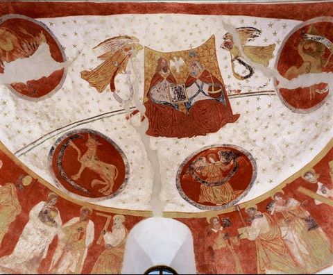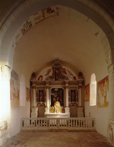 Les peintures murales, qui forment l’essentiel du décor de l’édifice, sont réparties sur l’arc triomphal (XIIe s.), les murs de la travée droite du chœur, ceux de l’abside et son cul-de-four (fin XVe ou début XVIe siècle). Les vestiges picturaux de l’arc triomphal représentent les travaux des mois, tandis que les peintures du chœur, un peu effacées par les badigeons qui les ont longtemps recouvertes, figurent la vie de saint Jean-Baptiste (prêche de saint Jean-Baptiste, décollation, festin d’Hérode). Les peintures de l’abside, qui sont les mieux conservées, forment un ensemble remarquable. Elles figurent, à la voûte, la Trinité entourée d’anges sonnant de la trompette et des symboles des Évangélistes, et sur les murs, le collège apostolique.