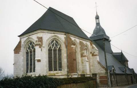 Eglise Saint-Martin. Le droit de patronage sur la cure de Bonvillers appartenait à l’abbaye Notre-Dame de Breteuil. C’est ce qui explique la différence de qualité entre le chœur dont la construction et l’entretien lui revenaient, et la nef qu’il incombait aux paroissiens, moins fortunés, d’élever et d’entretenir. La nef, close à l’ouest par un mur écran, dans lequel est percé un austère portail à fronton, est coiffée sur la première travée d’un clocher à lanternon couvert d’ardoises. Elle compte trois vaisseaux plafonnés, sous un même toit. Ses proportions trapues contrastent avec le chœur plus élancé, dont le vaisseau unique s’étire sur deux travées avant l’abside à trois pans. Entièrement voûté d’ogives, il est épaulé par des contreforts talutés, entre lesquels sont percées de vastes fenêtres à remplages flamboyants, aux piédroits savamment moulurés de doubles gorges, sous un cordon d’archivolte.