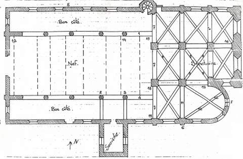 Les travées antérieures ont été profondément remaniées, sans doute au XVIIe s., lors de l’installation du clocher sur la première travée du chœur. Cette opération nécessita de renforcer les supports qui prirent l’aspect de puissants piliers quadrangulaires couronnés d’une corniche en fort relief. Les voûtes furent alors refaites, comme l’indique le profil prismatique des ogives. La chapelle nord, aussi vaste que le chœur, est percée au chevet d’une baie en plein cintre de plus grandes dimensions que la baie axiale : elle est coiffée d’ une archivolte reposant sur deux colonnettes en délit. Les puissants contreforts qui épaulent la construction sur son flanc nord et sur le mur du chevet indiquent une époque légèrement plus récente que le contrefort plus sobre de l’angle sud-est du chœur.