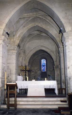La façade ouest est un ample mur pignon. La partie centrale délimitée par deux puissants contreforts à larmiers est percée d’un portail couvert d’un arc surbaissé et d’une grande fenêtre en arc brisé redenté d’un trilobe. Ces deux baies ne peuvent être antérieures à la fin du XVe siècle. Les demi-pignons des collatéraux sont percés au nord d’une baie en arc brisé, au sud d’une étroite fenêtre rectangulaire. La nef à trois vaisseaux s’étire sur cinq travées. Les bas-côtés très étroits sont percés sur les flancs de courtes fenêtres en plein cintre. Le vaisseau central est délimité par des files de colonnes. Certaines sont coiffées de chapiteaux des alentours de 1200 avec de beaux crochets séparés par des feuilles polylobées à la base de la corbeille, sous des tailloirs polygonaux profilés d’un filet sous un quart-de rond et un étroit bandeau. D’autres chapiteaux ont été refaits à la fin du XVe s., comme l’indique leur décor végétal naturaliste. La charpente du vaisseau central, dissimulée par un plafond moderne, conserve sur les fermes les marques de fixation d’un lambris en berceau brisé. Une tourelle d’escalier polygonale s’élève à l’extrémité du bas-côté nord. À la différence de la nef, les parties orientales sont voûtées sur croisées d’ogives. La dernière travée du chœur, percée au chevet d’une simple baie en plein cintre, a conservé sa structure d’origine avec des piliers d’angles composés, sommés de chapiteaux ornés de feuilles nervurées ou lisses et recourbées en volutes. Les ogives profilées de deux tores séparées par un onglet confirment une datation vers 1200. La clef est ornée d’un disque où est inscrite une croix aux extrémités fleur de lysées.