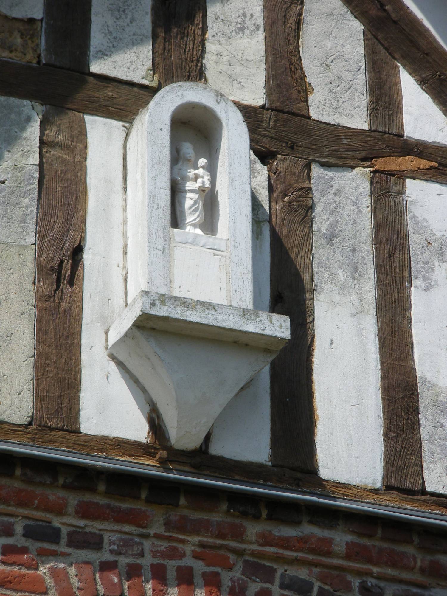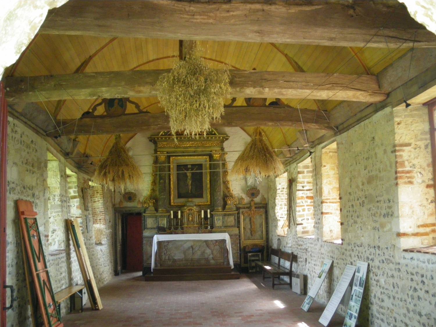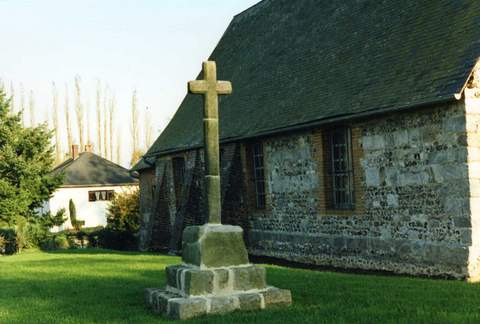 Devenue de nos jours une chapelle sur la commune de Bosc-le-Hard, l’ancienne église paroissiale d’Augeville – commune réunie à Bosc-le-Hard le 6 septembre 1813 – forme avec le calvaire et le puits adjacents un ensemble charmant au cœur du Pays de Caux. L’église est placée sous le vocable de saint Éloi. De plan rectangulaire et à chevet plat, l’ édifice, sans travées délimitées, semble, par son volume, remonter pour la plus grande partie à la fin du XVIème s. ou au déb ut du XVIIème siècle. Seul subsiste comme élément antérieur la porte romane percée dans la façade ouest dont les claveaux sont ornés d’un motif de pointes de diamant surmonté d’une corde. L’édifice a été restauré à plusieurs reprises : des baies avec encadrements de briques ont été percées dans les murs nord et sud , pour certaines dès le XVIIIème s., comme permettent notamment de le constater les huisseries subsistantes ; une sacristie a été édifiée contre le chevet (XIXème s.); des contreforts en brique ont été montés contre le mur nord pour éviter le dévers provoqué par le retrait des entraits du chœur (fin XIXème – début XXème s.). Quant au clocher d’ardoises qui couronne de façon heureuse le mur pignon ouest, il serait postérieur aux pérégrinations archéologiques de l’abbé Cocher qui en note l’absence lors d’un de ses passages. Mais ses bonnes proportions et le mélange des matériaux utilisés – grès, tuf et silex – confèrent un charme certain à la façade. A l’intérieur, la voûte lambrissée très endommagée révèle un état d’abandon d’autant plus regrettable que l’église renferme un mobilier non dépourvu d’intérêt : maître-autel en bois doré du XVIIème s. avec retable et toile représentant la Crucifixion, clôture de chœur servant d’arc triomphal et prenant son appui sur deux autels ornés chacun d’un médaillon peint, boiseries… L’identification d’un fragment de litre funéraire a permis de retrouver les armes de la famille Brossard. L’ensemble exigeait une restauration complète qui a été définie en trois campagnes. La première, pour laquelle la Sauvegarde de l’Art Français est intervenue à hauteur de 25 000 F en 1995, concernait le drainage, la consolidation des murs et la réfection de la charpente et de la toiture. Les campagnes suivantes s’intéresseront notamment à la restauration des huisseries et de la voûte lambrissée.