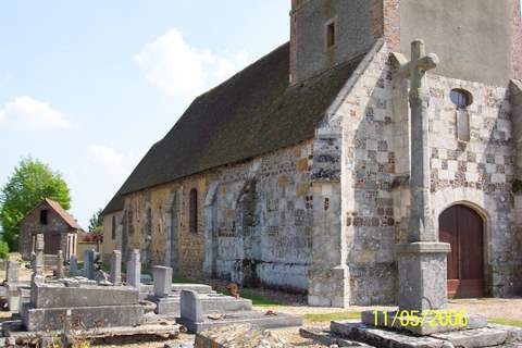 Église Saint-Jean-Baptiste. La commune des Bottereaux se situe en pays d’Ouche. La paroisse, de fondation ancienne, dépendait au XIe s. de l’abbaye de Lyre, à laquelle elle avait été donnée par Guillaume Fitz-Osbern. Son plan, comme celui de nombreuses églises de cette région, est très allongé, la nef étant prolongée par un chœur un peu plus étroit, qui se termine par un chevet droit sur lequel a été adossé une sacristie à pans coupés ; la nef est précédée, à l’ouest, d’une tour formant porche. Les éléments les plus anciens sont situés dans la partie basse du mur nord, où l’on peut discerner un appareil en arêtes de poisson, tandis qu’apparaît encore le contour d’une petite fenêtre ancienne, murée, ces deux témoins pouvant dater du XIe s., la partie haute des murs, percée de deux baies cintrées en grison n’étant pas antérieure au XIIe siècle. Dans la partie occidentale de la nef s’ouvre une large fenêtre en arc brisé qui pourrait dater du XVe s., le mur sud est percé d’une fenêtre en tiers-point du XVIe siècle. Le chœur est éclairé par deux fenêtres du XVIe s., il a été remanié au XVIIIe et au début du XIXe s., ce dont témoigne notamment la date de 1814, portée sur une des baies. Les tirants et poinçons de la voûte de la nef ont été supprimés en 1843. L’église est précédée, à l’ouest, par un porche dont l’appareil forme un motif de damier, en grès et en silex, ce décor s’étend sur la partie extérieure de la première travée de la nef. Au-dessus de la porte a été percée une niche qu’un oculus a recoupé ultérieurement, avec quelque maladresse. La tour est datée dans la partie basse, du XVIe s., la surélévation, du XVIIIe s., est coiffée d’une toiture en dôme. La pierre tombale d’Henriette d’Espine, morte en 1610, sert de marche pour l’entrée dans l’église. Des contreforts en grès avec glacis épaulent les murs de la nef et la façade occidentale. La tour contient deux cloches fondues par Jean Aubert en 1719, qui firent l’objet d’une nouvelle fonte en 1861 par Hildebrand.