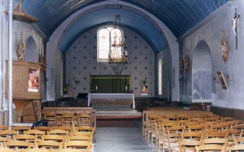 Une église primitive devait exister dès le XIIème s., mais l’édifice actuel date du XVIIème siècle. Il se compose d’une nef unique, rectangulaire, voûtée en berceau de lattis plâtré, dont le sol est carre lé de terre cuite. Servant de bras de transept, de part et d’autre de la nef, deux petites chapelles rectangulaires plafonnées sont éclairées par des fenêtres en anse de panier. Celle du sud possède un autel avec tabernacle et tableau en trumeau du XVIIIème siècle. Le chevet plat est éclairé par une fenêtre en anse de panier. A droite du chœur s’ouvre une ancienne chapelle qui sert de sacristie. La partie ouest de la nef est surmontée d’un clocher carré terminé par une petite flèche très mince. Les toitures, le clocher avec sa flèche sont couverts d’ardoises.