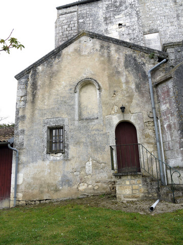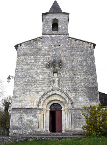 La façade occidentale est simple et sans contreforts. Le rez-de-chaussée comprend un portail à trois voussures, dont la plus extérieure forme un arc un peu brisé sous une archivolte, qui se poursuit en bandeau jusqu’aux angles et, en retour, sur la face nord. Les deux autres voussures sont en plein cintre, et il y a apparence qu’elles ont été reprises au XVIIe s., ce que ne dément pas l’ornementation des quatre chapiteaux que supportent des colonnettes en délit sur bases en cloche. Ce décor, plus gravé que sculpté, n’a pas d’équivalent dans la sculpture romane de l’Angoumois et pourrait être un essai archaïsant dû à un artisan sculpteur du XVIIe siècle. On ne sait s’il représente, comme cela a été écrit, « la chute et la rédemption du genre humain ». On y pourra voir plus simplement, au milieu de feuillages au trait léger, quelques oiseaux et un serpent. Au-dessus du portail ouvre une petite baie quadrangulaire moulurée sous les consoles conservées d’une bretèche. La partie haute, nue et remaniée, correspond à une faible pente du toit et porte en son centre un modeste clocher carré moderne, percé d’une baie sur chacun de ses côtés, sous un petit toit aigu couvert d’ardoises.
