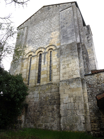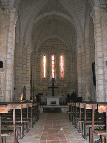 Elle forme en plan un long rectangle orienté, se développant comme suit : à l’ouest, derrière la façade, un massif barlong sous berceau, très remanié au XVIIe s., ouvrant largement sur une nef unique de trois travées dont le berceau sous doubleaux portés par des colonnes engagées à chapiteaux nus, a été refait en brique au XIXe siècle. Puis vient une travée carrée, peut-être sous clocher à l’origine, dont le voûtement initial probable (en coupole sur pendentifs) a été remplacé par une voûte d’ogives contemporaine. Elle a reçu au nord – et non au midi comme on le trouve écrit – une petite chapelle carrée tardive voûtée d’ogives qui a été fort remaniée. Une dernière travée carrée à l’est sert de chœur ; elle a conservé dans son mur sud une piscine à deux cuvettes. La voûte d’ogives à triple rang de chevrons qui la couvre peut être rapprochée de celle de l’église voisine de Dirac[1]. Un mur droit percé d’un triplet éclaire le chevet. Deux larges contreforts plats montant jusqu’au départ de la toiture l’encadrent à l’extérieur. Les fenêtres latérales de l’édifice, à raison d’une par travée, sont étroites, cintrées et sans décor au- dehors, ébrasées vers l’intérieur Le récent nettoyage externe des gouttereaux permet de distinguer aisément les reprises et restaurations anciennes de l’appareillage.