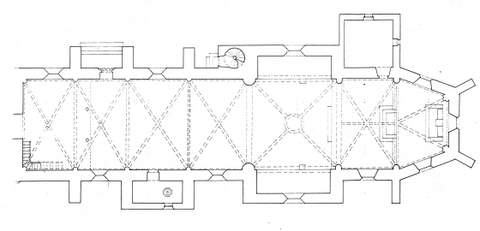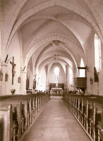 La nef unique s’étend sur quatre travées barlongues. Le transept est légèrement saillant. Le chœur, également rectangulaire, est formé d’une travée et se termine par une abside polygonale à trois pans. Le voûtement de la nef est formé d’arcs d’ogives qui retombent sur des colonnes engagées dont les fûts se terminent par des moulures. Une lierne longitudinale renforce la travée du chœur et les arcs de l’abside reposent sur des groupes de trois colonnettes. Les travées sont séparées par des arcs doubleaux brisés, ceux délimitant la partie centrale du transept étant plus épais. L’élévation est à étage unique, les travées étant percées de fenêtres autrefois divisées par des meneaux en grande partie détruits. Certaines ouvertures conservent des remplages ou des traces de remplages flamboyants. Les fenêtres de l’abside en lancette sont à l’extérieur coiffées d’une archivolte reposant sur des culots sculptés de têtes humaines. La façade ouest est percée d’une porte en arc brisé bordé de plu sieurs moulures prismatiques et d’un œil-de-bœuf. Un clocher en bois, sans doute ajouté au XVIIème s, est surmonté d’une flèche en ardoise. Des contreforts saillants contrebutent les poussées à l’extérieur. Un baptistère a été aménagé entre deux contreforts et une sacristie accostée au nord du chœur.
