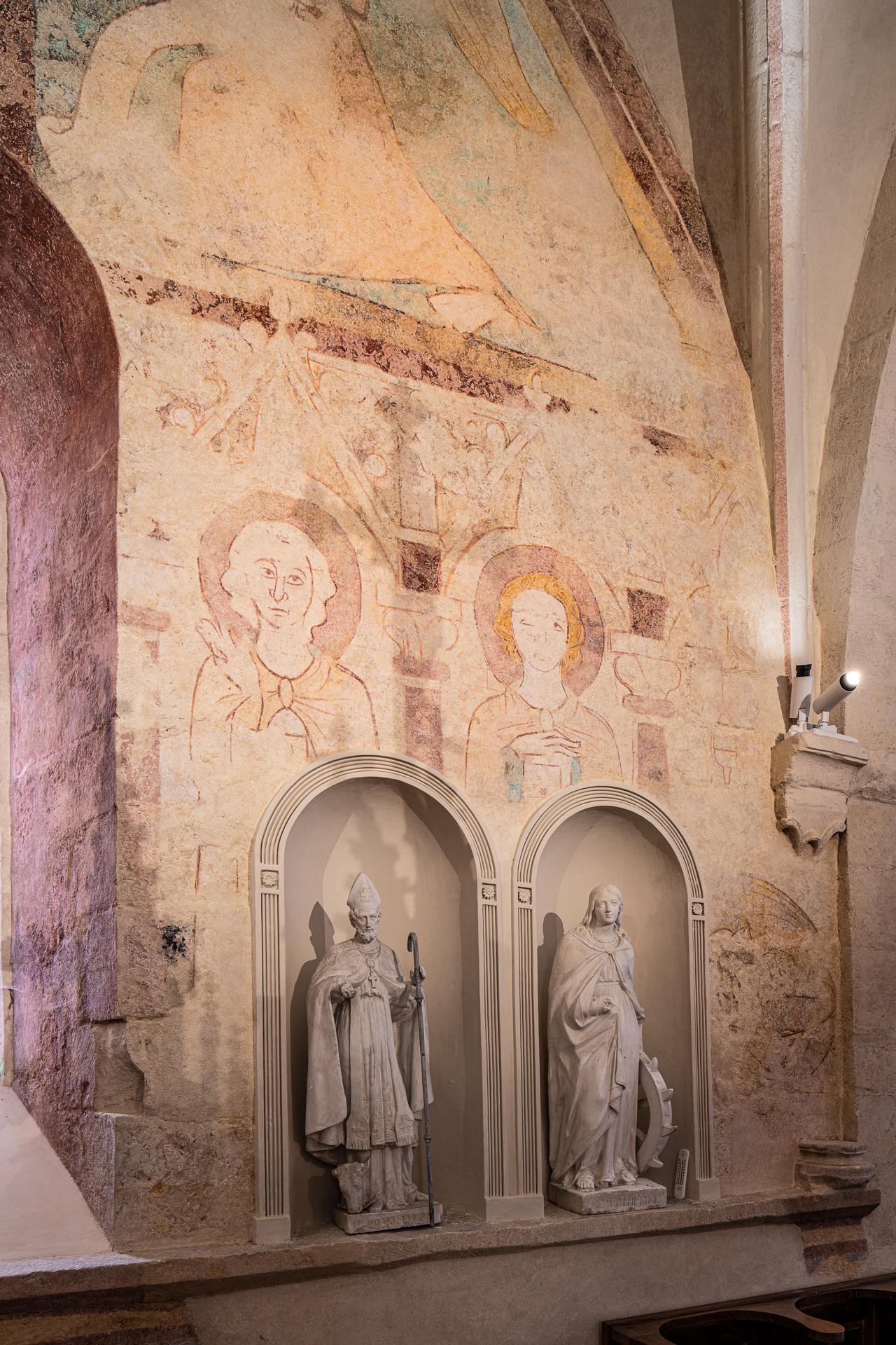 Le chœur de plan carré est voûté sur croisées d’ogives. Ses nervures retombent sur des tailloirs engagés dans la maçonnerie à l’est et sur des chapiteaux historiés à l’ouest. De nombreuses interrogations demeurent encore sur la chronologie de la construction du voûtement du chœur. Des sondages réalisés en 2005 par Gérard Emond ont révélé la présence de peintures murales représentant des figures monumentales. Elles pourraient dater de la fin du XIIIe ou du début du XIVe siècle et ne semblent pas être postérieures à la construction des voûtes. Sur le mur sud, un personnage ailé et un autre tenant un livre, probablement une représentation du tétramorphe, apparaissent partiellement. En complément des premiers sondages, une étude approfondie des décors du chœur a été conduite par Isabelle Rosaz en 2017. Leur restauration est prévue en 2019.