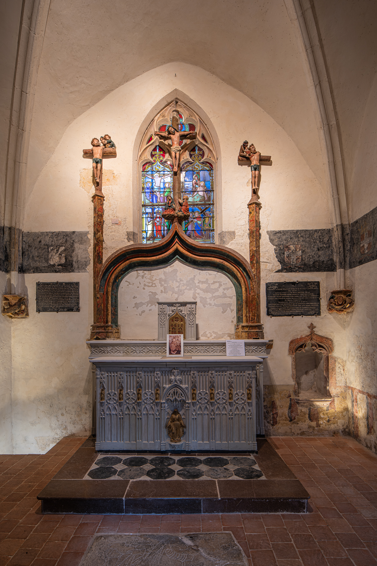 Datant de la première moitié du XVIIe siècle, la chapelle sud est moins richement décorée que la précédente. Le bel autel galbé du XVIIIe s, en pierre rose, était l’ancien maître-autel dont l’emmarchement subsiste dans le chœur. Au XIXe siècle, un monumental autel néogothique en fonte le remplace dans le chœur, complété par la chaire et la table de communion toujours conservées aujourd’hui.