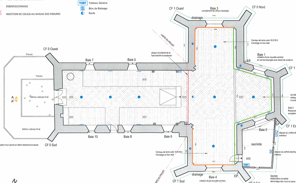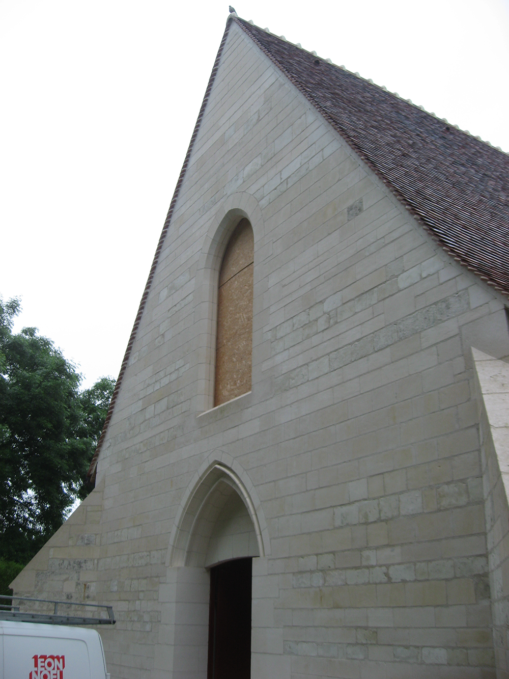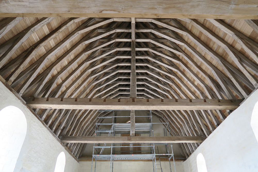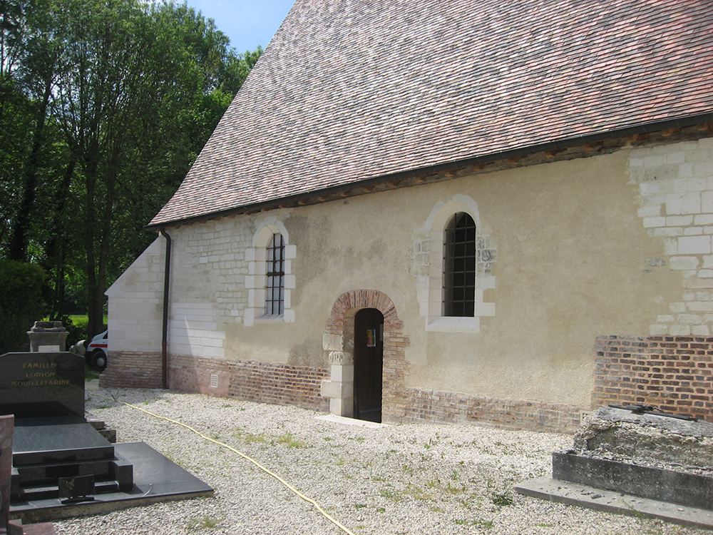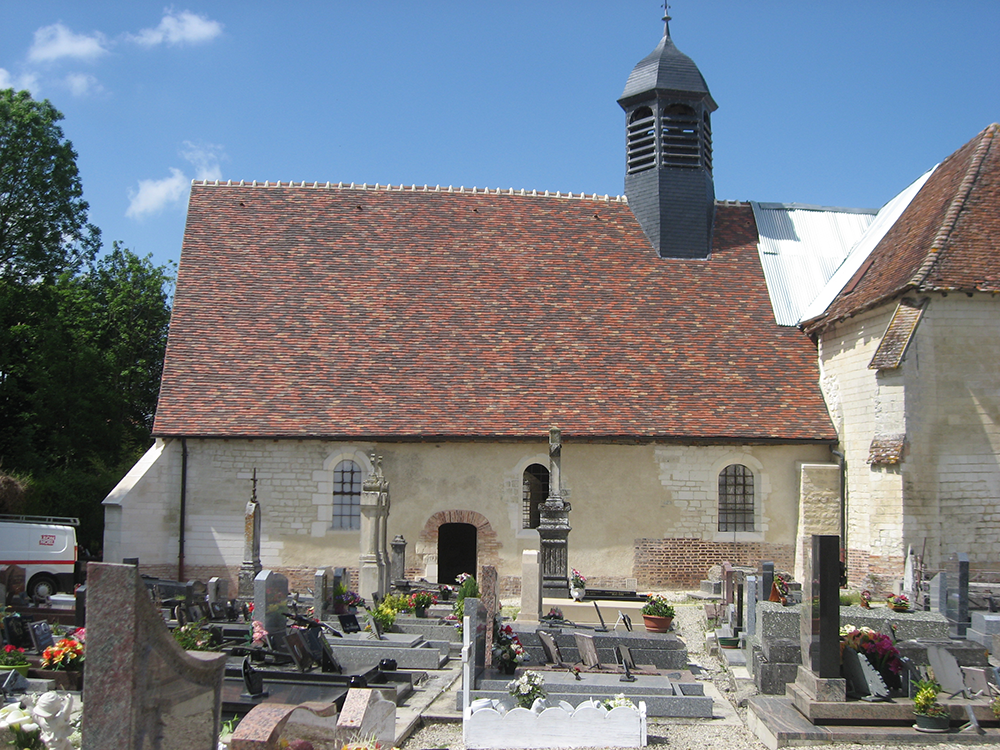 Les combles de la nef, moins élevés que ceux du transept, sont surmontés d’un campanile couvert en ardoise, abritant une cloche de 1578. Le chœur a été construit au XVIème siècle, il est délimité par deux piliers ondés aux angles du transept.