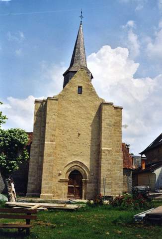 L’extérieur, très séduisant par son appareil de grès rosé alternant avec un moellonnage de teinte semblable, offre la même simplicité que le dedans. Les murs latéraux ont conservé une partie de leur corniche chanfreinée que supportent des modillons à masques grossiers. Deux larges contreforts plats, soigneusement appareillés, raidissent les angles de l’édifice à l’est et à l’ouest. Entre ces derniers, une porte en arc brisé ouvre dans la façade nue. Sa modénature – deux voussures sous archivolte en chanfrein – et ses chapiteaux végétaux formant frise sont plus schématiques que ceux qu’on voit d’ordinaire aux portails des églises limousines du XIIIe siècle. Au-dessus, le mur sans ouverture se termine par un pignon aigu. Dans l’angle rentrant du contrefort méridional, un départ de nervures d’ogives, de facture plus récente, laisse seul penser qu’un haut porche a pu abriter le portail à la fin du XIIIe siècle. La toiture à deux versants, en tuiles plates, a été remarquablement réparée. En arrière de la façade s’élève un clocher octogonal en charpente, couvert de bardeaux comme la flèche aiguë qui le termine.