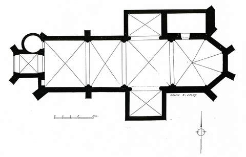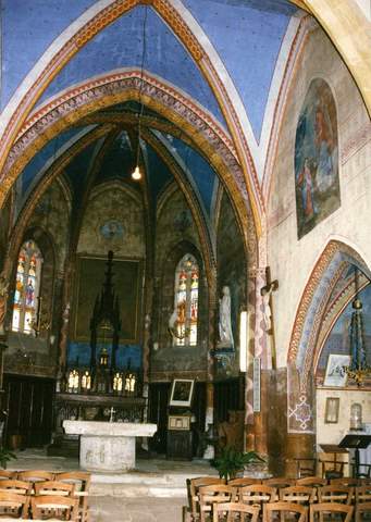 L’église de Bournazel, placée, sous le vocable de saint Barthélemy, est de fondation ancienne, puisque l’un des plus premiers textes la mentionnant date de 1136, époque à laquelle le chapitre de Sainte-Cécile d’Albi est confirmé dans sa possession. Mais l’édifice dans son état actuel remonte pour une grande part à la fin du XVe, voire au début du XVIe siècle. Une description de 1845 mentionne que l’église, « voûtée dans le genre gothique » est alors « en assez bon état », malgré la nécessité de réparations des toitures. C’est en 1875 cependant que l’édifice connaît une très importante campagne de restauration. Durant tout l’Ancien Régime, la cure était à la nomination de l’évêque d’Albi cependant, en raison de la proximité géographique, Bournazel a toujours entretenu des liens étroits avec la cité de Cordes. De plan très simple, l’église, à vaisseau unique, comprend une nef de trois travées, d’inégales dimensions, et se poursuit par un chœur, légèrement surélevé, d’une travée droite se terminant par une abside à pans coupés. Deux chapelles latérales dessinent avec la travée de la croisée une sorte de faux transept. Un clocher-porche permet à l’ouest l’accès à l’édifice. Il est flanqué d’un escalier hors-œuvre menant à la tribune qui occupe le premier niveau du clocher. Une sacristie a été édifiée le long de la façade nord, dans le prolongement de la chapelle. Le chevet est ceint de contreforts peu élevés qui donnent à penser que l’église a été surélevée au moment de son voûtement. L’édifice est construit en blocage de moyen appareil irrégulier, recouvert d’un enduit disgracieux sur la façade occidentale et la première travée de la nef. Cette intervention correspond à la campagne de 1875, au cours de laquelle on entreprit de reprendre dans sa totalité le massif occidental et de surélever, voire d’édifier le clocher-porche, de plan carré à sa base et de forme octogonale au niveau du beffroi, couronné d’une flèche d’ardoise à huit pans. À l’intérieur, l’église est voûtée sur croisées d’ogives ; les nervures possèdent un élégant profil. Le chœur pour sa part est couvert d’une voûte sexpartite. L’édifice est peu éclairé ; les ouvertures de la première travée de la nef ont été reprises au XIXe s. ; les plus anciennes sont celles qui ont été percées dans chacun des deux pans coupés du chœur. L’œil est attiré par l’élégant décor polychrome qui a été réalisé au XIXe s. sur les murs et les voûtes de la troisième travée de la nef et du chœur ; l’azur étoilé peint sur les voûtains contraste heureusement avec les décors de rinceaux produits sur les ogives et les piles. Pour la réfection de la couverture, la reprise des maçonneries de la sacristie et la pose d’un nouveau beffroi et d’un paratonnerre, la Sauvegarde de l’Art français a octroyé une subvention de 50 000 F en 1998.