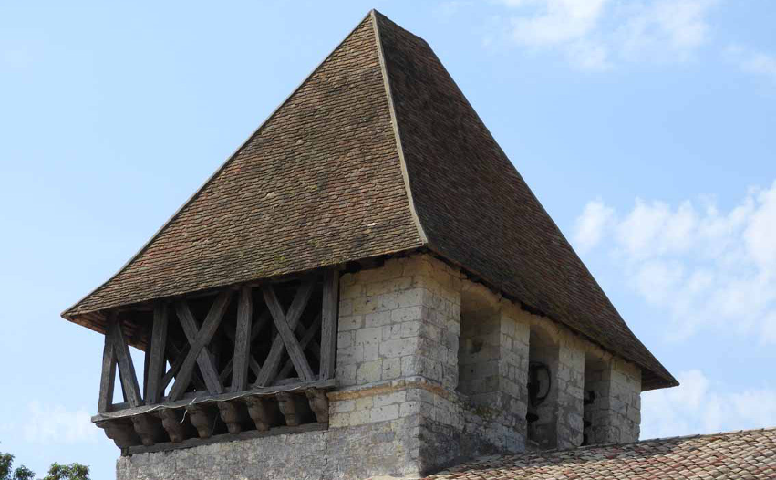 Le mur Ouest du clocher loge les cloches dans deux arcades et supporte le toit avec un pan de bois à claire voie, élevé sur les trois autres faces.