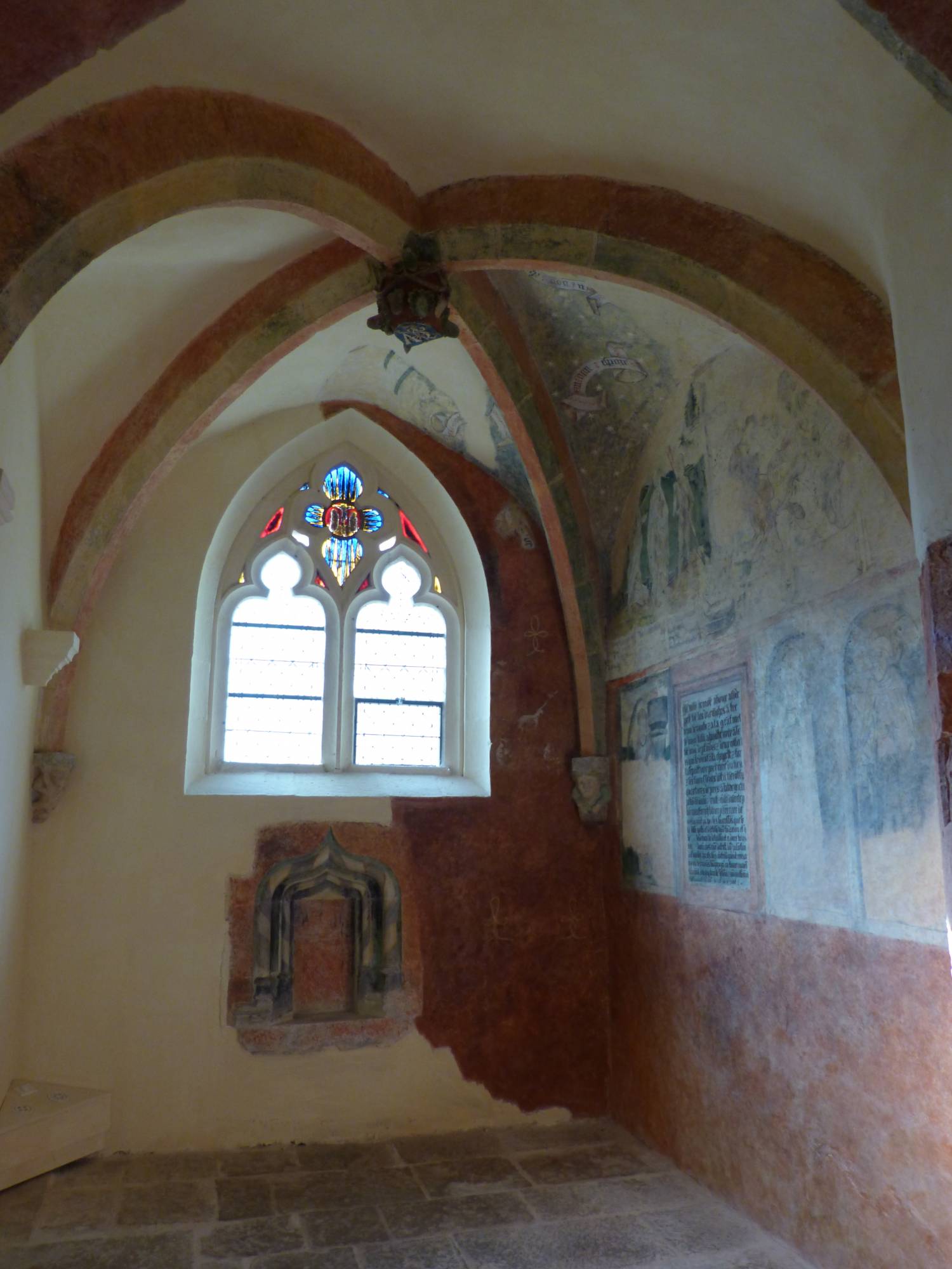 Côté nord, ce faux-transept communique, par une arcade en tiers point, avec une chapelle voûtée d’ogives à clé sculptée.