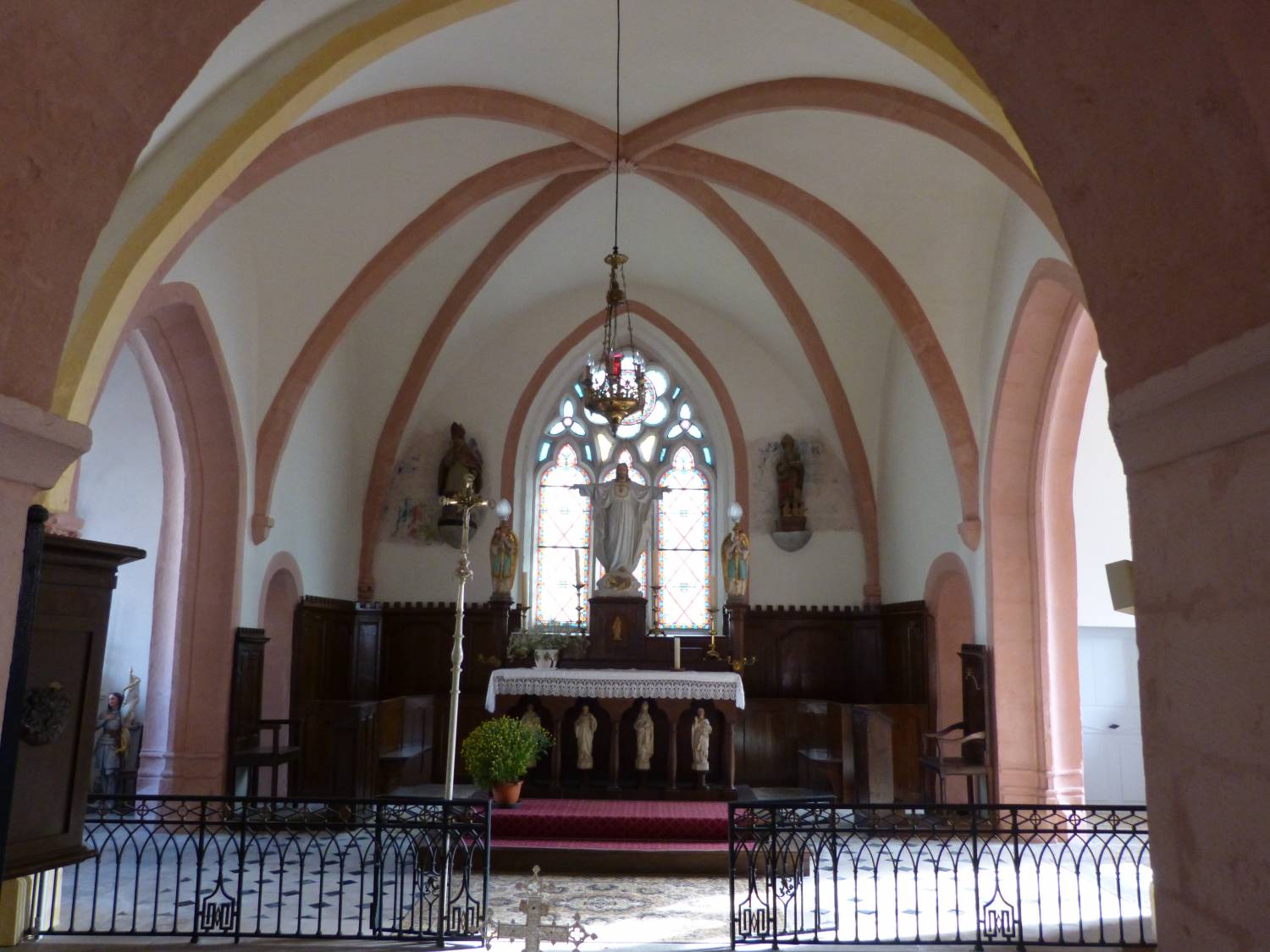 Le plan général, orienté, en forme de croix latine, est composé d’une nef, d’un faux-transept, d’un chœur et de chapelles latérales.