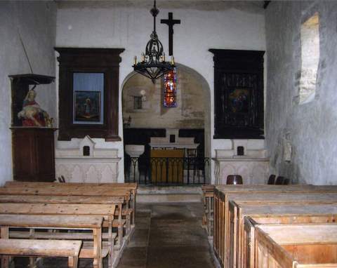 La nef, également du XIIIe s., légèrement décalée vers le nord, communique avec le chœur par une arcade étroite au profil un peu surbaissé. Elle est couverte par une charpente apparente du type à chevrons formant fermes, renforcée par quatre entraits, chacun assemblé à un poinçon. Un soin particulier a été apporté pour l’exécution de ces pièces de charpente très visibles : toutes sont chanfreinées et moulurées, et les poinçons sont munis de bases et de chapiteaux. Les dispositions de cette charpente ainsi que ses divers profils indiquent une campagne de travaux datant vraisemblablement du XVe siècle. La nef est éclairée par des baies rectangulaires chanfreinées, deux percées sur le mur sud et une sur la façade occidentale. Celle-ci est percée de deux portes ; la plus grande est légèrement désaxée vers le sud pour permettre l’insertion d’une petite porte contre le contrefort nord. La porte principale, aux jambages chanfreinés, est couverte d’un linteau évidé d’un arc en plein cintre en orbevoie encadrant une croix fleurdelisée ; ses coussinets sont moulurés. La petite porte, traitée plus simplement, est ornée d’une sorte de cartouche découpé dans son linteau. Une croix similaire à celle de l’autre porte, encadrée par deux colonnettes, y est sculptée en relief. Ses coussinets sont décorés d’une feuille stylisée.