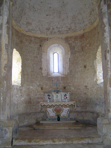 À l’intérieur, le chœur est voûté en cul-de-four. La décoration extérieure de la fenêtre axiale se retrouve à l’intérieur ; les extrémités de l’archivolte sont toutefois dégradées. Les trois ouvertures sont garnies de vitraux au plomb. Les vitraux des ouvertures latérales sont ornés l’un de ceps de vigne, l’autre d’épis de blé rappelant la dévotion à Notre-Dame des Champs instaurée au début du XXe siècle. Ces vitraux, installés en 2013, sont l’œuvre de Madame Lépiney, de Gondrin. Le mur de l’abside présente une légère saillie, comme une amorce de banquette, à environ 60 centimètres du sol ; un bandeau souligne le passage du mur à la voûte. L’autel Louis XV a été remis en place et un tabernacle du XIXe s. a été ajouté. De part et d’autre de l’arc triomphal, ont été placés deux éléments mutilés de l’ancien retable en bois (XVIIIe s. rustique ou XIXe s.). La fenêtre axiale est restée murée jusqu’en 1970. L’église conserve un bénitier de pierre formé de deux cylindres superposés, surmontés d’une cuve à pans, deux statues de la Vierge, dont l’une de Notre-Dame des Champs, et une statue de saint Roch.