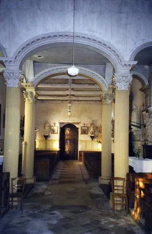 À l’intérieur, l’église présente un décor intéressant de l’extrême fin du XVIIIe siècle : sous la peinture brune du maître-autel effectuée au XIXe s., transparaît un décor en faux marbre dans les tons bleu et vert. À l’architecture de ce retable avec ses colonnes jumelées cannelées et sa corniche denticulée répond le décor de staff de pilastres cannelés à chapiteaux corinthiens qui, entre les fenêtres du chœur, s’élève sur tout son pourtour, au-dessus des lambris. L’entablement qui couronne l’élévation, forme une ligne continue avec la corniche du maître-autel, détail parmi d’autres qui prouve la qualité des soins apportés à la réalisation de cette commande. Le tabouret qui supporte le clocher a lui-même été habillé d’un décor semblable de colonnes cannelées surmontées de chapiteaux corinthiens.