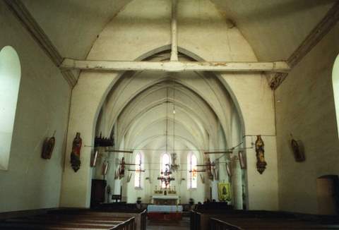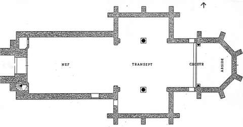 La nef unique a été recouverte au XVe s. d’une charpente en cintre brisé avec entraits et poinçons apparents. Les bras du transept s’ouvrent sur la croisée par deux grandes arcades en arc brisé reposant sur une colonne centrale. Le chœur est composé d’une travée droite et d’un chevet à cinq pans largement éclairé. Toute la partie orientale de l’église est voûtée de croisées d’ogives et le chevet s’achève par une voûte d’ogives rayonnante à six branches.