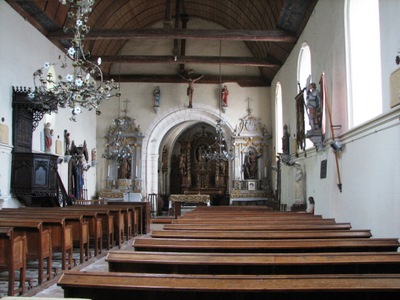 À l’intérieur, la nef est couverte d’une charpente lambrissée reposant sur six entraits. Les sablières sont ornées de motifs végétaux. Au mur séparant la nef du chœur sont appuyés deux autels datant du XIXe s., dédiés à saint Nicolas et à saint Joseph. Les voûtes du chœur, sur croisées d’ogives, reposent sur des piles à colonnes engagées, par l’intermédiaire de tailloirs cubiques et de chapiteaux figurés ; les bases des colonnes à décor annulaire ont 30 centimètres de hauteur. Au sud, l’ouverture est encadrée de deux colonnettes surmontées de chapiteaux. Au-dessus du maître-autel repose un retable en bois daté de 1655, de Pierre Lambert. De part et d’autre du retable ont été placées les statues de saint Michel et de saint Jean à la Coupe. L’église contient également plusieurs statues en pierre du XVIe siècle : un groupe figurant saint Côme et saint Damien (XVIe s.), sainte Clotilde, sainte Catherine, la Trinité, et un saint Sébastien en bois du XVIIe siècle.