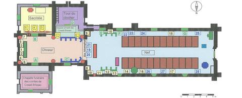 Le plan de l’église est allongé : il se compose d’une longue nef, d’un chœur un peu plus étroit, comportant deux travées, avec chevet plat. Un clocher de plan carré s’élève au sud ; il communique avec la travée occidentale du chœur. Une sacristie a été construite au XIXe s., dans l’angle formé par la travée orientale du chœur et le clocher. Enfin, au nord de cette travée de chœur, s’élève la chapelle funéraire des Cossé-Brissac.
