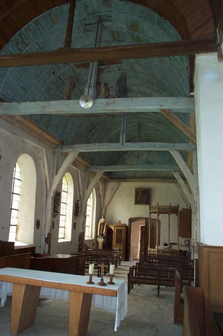 À l’intérieur, la charpente apparente, où subsistent des traces de décor peint, repose sur une corniche et des chandelles posées à même le sol.