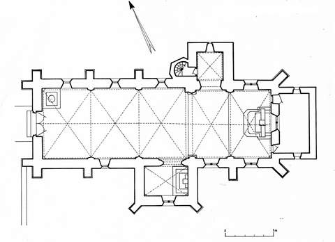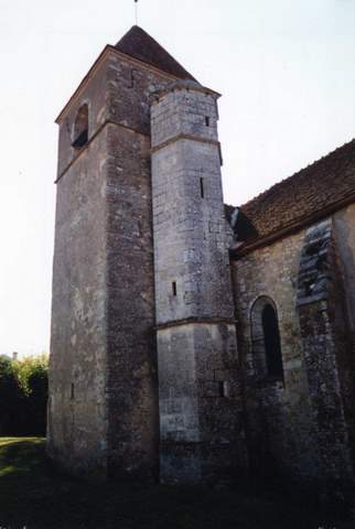 Au nord, le clocher, reconstruit au XVIIIème s., s’élève au-dessus d’une chapelle carrée. Ce clocher n’est qu’une tour nue, ajourée au sommet sur les quatre faces de baies en tiers-point. Il est cependant flanqué, à l’ouest, d’un joli escalier à vis hexagonal en pierre de taille appareillée du XVIème siècle. L’ensemble de l’édifice est voûté sur croisées d’ogives à liernes dont les nervures, à moulures prismatiques, retombent sur des piliers engagés. Quant aux nervures prismatiques des chapelles, elles retombent sur des écussons et des animaux sculptés.
