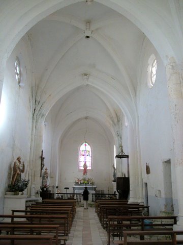 On conserva les piliers et colonnes de la travée romane sous clocher, avec leurs bases à deux tores inégaux que sépare une large scotie, mais on en bûcha les chapiteaux pour permettre l’établissement de voûtes d’ogives à pénétrations, procédé fréquent que l’on retrouve, entre autres, aux nefs charentaises de Ruffec et de Saint-Saturnin. Le plan actuel comprend donc une courte nef d’une travée suivie de la travée sous clocher, puis un chœur à chevet plat de deux travées carrées, le tout couvert de quatre voûtes d’ogives du XVesiècle. Les clefs des voûtes ont reçu une sculpture variée : Agneau nimbé, cercle dans un triangle curviligne bordé d’une crête trilobée dans le chœur, et les doubleaux portent masques, fleurs de lys tenues par des dauphins sous un lion, une femme, un ange tenant un écu. D’autres reliefs de même facture – singes, petit moine, chouette, crapaud – peuplent la large gorge qui marque l’arc brisé de la baie d’axe, qui a perdu son remplage. De même conserve-t-on dans le chœur une jolie piscine à l’ornementation flamboyante assez grasse.