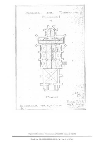 L’ÉGLISE PAROISSIALE NOTRE-DAME s’élève à proximité d’un ancien château dont il ne reste rien, au point le plus haut du village, sur un éperon formé par la vallée de la Bar et la trouée de Noirval. D’après le pouillé du diocèse de Reims, antérieur à 1312, l’église était placée sous le patronage de l’abbaye de Mouzon. Les murs gouttereaux de la nef présentent les caractères du roman tardif et sont datables du début du XIIIe siècle : petites fenêtres en plein cintre et porte latérale nord couverte d’un linteau en bâtière décoré d’un arc trilobé et d’une croix pattée. Ils témoignent de l’existence d’un vaisseau unique charpenté de plus de dix mètres de large, solution alors assez peu répandue dans les Ardennes.