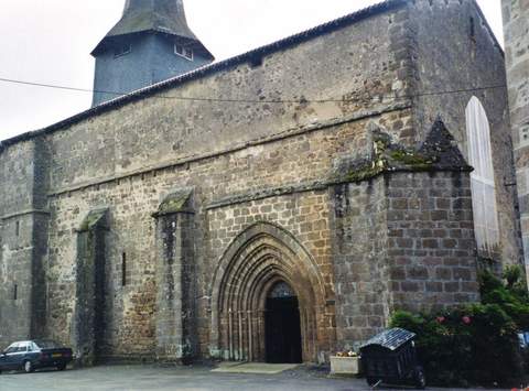 Le portail ouvre au nord de la travée occidentale, dans un avant-corps plat encadré de deux gros contreforts, le tout en granit appareillé. Il est caractéristique des portes limousines du XIIIe siècle : très ébrasé, avec quatre voussures nues amorties d’un mince tore d’angle et séparées de colonnettes de même diamètre par de petits chapiteaux, tandis qu’un tore plus gros marque l’intrados d’une cinquième voussure.