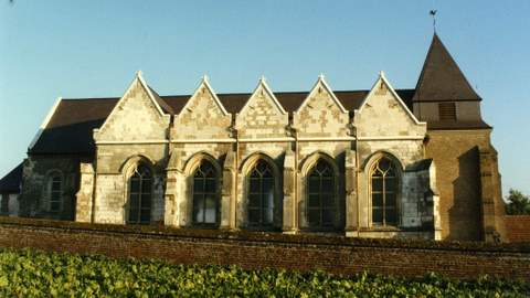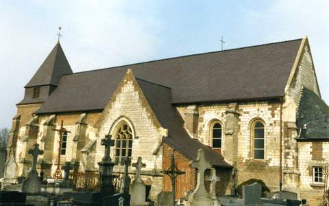 La nef de cinq travées est flanquéed’un unique collatéral au nord et d’une chapelle au sud. A l’est s’étend sur deux travées le chœur à chevet plat. Toutes ces parties sont construites principalement en craie, un matériau tendre qui a été à plusieurs reprises restauré par incrustation de briques, ce qui donne un aspect mosaïqué au monument. Les parties basses du clocher, notamment les vestiges d’un portail ouvrant sur la nef ainsi que le vaisseau principal de cette nef, paraissent remonter auXIIIème siècle. La chapelle sud pourrait avoir été fondée par Emeline de Brissay en 1290.