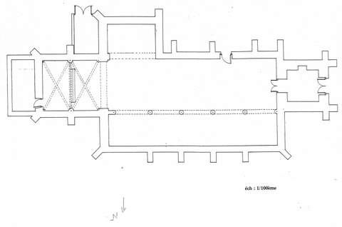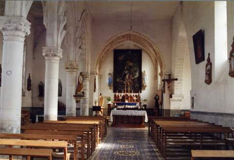 Le remplage rayonnant de la fenêtre de la chapelle est moderne, mais pourrait reprendre les lignes du réseau d’origine. Le chœur est la seule partie de l’église voûtée d’ogives. Le profil très aminci des arcs, le décor des chapiteaux à corbeilles basses incitent à penser qu’il est nettement plus récent, peutêtre de la fin du XIVème siècle. Au XVIème s., un collatéral a été ajouté au nord de la nef. Une file de colonnes recevant des arcs brisés l’en sépare. Les amorces d’ogives qu’elles supportent aussi bien vers le collatéral que vers le vaisseau principal de la nef, indiquent qu’on projetait de voûter l’ensemble, sans doute dans l’intention d’étendre ce parti au sud de la nef, pour obtenir une église de type halle, mieux adaptée pour accueillir une population accrue. Faute de ressources, ces travaux ambitieux restèrent inachevés, les piliers dressant en épis pittoresques les départs d’ogives.