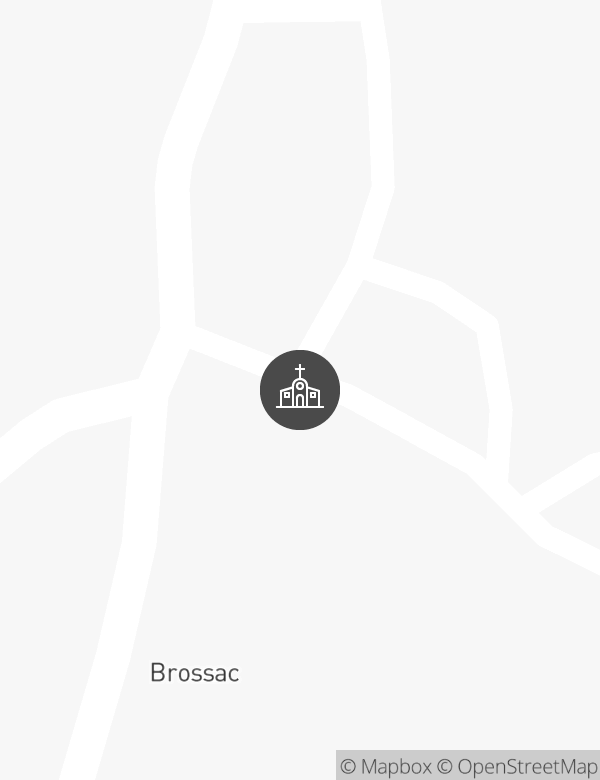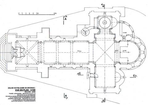 L’église de Brossac, dont la silhouette austère domine une butte de grès rendue plus abrupte par les travaux de voirie du XIXe s. qui lui font comme un socle, a été bâtie de façon homogène dans la seconde moitié du XIIe s. avec une nef unique de trois travées sous berceau, renforcée à l’extérieur et à l’intérieur par une arcature en plein cintre encadrant les fenêtres, un transept saillant doté d’absidioles sur le mur est et un chœur terminé en hémicycle, renforcé par une arcature interne sous cul-de-four et pourvu aussi d’une arcature extérieure. Le clocher est placé, de façon inhabituelle, non à la croisée du transept, mais sur son bras nord, où une très courte travée (1 m à peine de profondeur) précède une seconde travée de plan carré, coiffé d’une petite coupole sur pendentifs reposant sur de puissants dosserets. Le fait qu’à l’extérieur, les contreforts et les parements servant de socle à ce clocher englobent totalement l’absidiole, alors que celle du croisillon sud est bien visible, laisse à penser qu’il s’agit là d’une disposition d’origine, mais la cage carrée de la vis qui le dessert a été refaite à l’époque gothique. La croisée est aujourd’hui couverte d’une voûte d’arêtes tardive, succédant à une autre, disparue, dont la date de 1697 est encore visible en partie haute. On ne peut donc savoir si le clocher primitif était prévu à cet endroit comme c’est ordinairement le cas, et ce qui a pu conduire les constructeurs à la disposition actuelle. L’étage campanaire carré a d’ailleurs été rebâti en 1860 avec deux baies par face sous une flèche en ardoise, remplacée depuis par un toit bas à quatre pans.