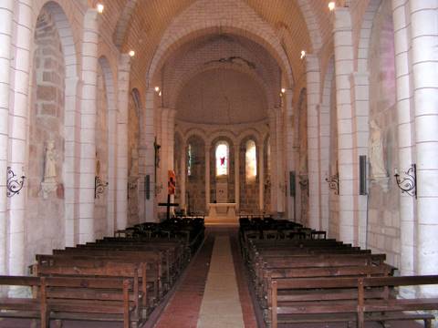À une époque indéterminée mais ancienne, un parapet crénelé, aujourd’hui assez altéré, suréleva le chœur et la nef, accentuant la sévérité majestueuse de l’ensemble. À la période gothique, on détruisit la façade primitive pour allonger l’église d’une travée voûtée d’ogives, et un portail en arc brisé à trois voussures sous archivolte, à chapiteaux en corolle assez dégradés, que surmonte une baie en arc brisé, remplaça, plus à l’ouest, le portail roman détruit. De longues lancettes étroites éclairèrent latéralement cette travée qui porte encore, à l’extérieur, du côté nord, les restes de deux enfeus, et qui reçut une voûte d’ogives. La voûte actuelle, qui est datée de 1902, a été refaite en brique enduite dans le style du début du XIIIe s., mais l’aspect du reste de la travée interdit, et de loin, une datation aussi haute. Le XIXe s. a pourvu la nef d’un berceau trop brisé et a refait, en calcaire, dosserets, colonnes et doubleaux. De même, c’est en calcaire qu’on a repris les colonnes engagées de l’arcature intérieure du chœur, avec des chapiteaux à palmettes qui n’ont rien de médiéval. Les bases anciennes, à la croisée, portent normalement deux tores que sépare une scotie. Ils conservent des vestiges de griffes, et les chapiteaux d’origine sont nus, avec, aux angles, des boules ou de petits masques assez frustes.