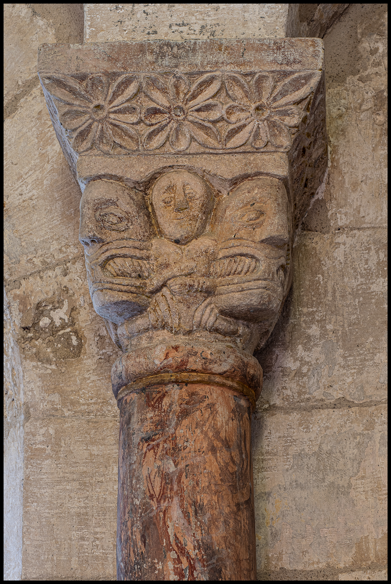 L’abside semi-circulaire, typiquement romane, voûtée en cul-de-four, est la partie de l’église la plus intéressante pour la décoration. Extérieurement, on notera la sobriété du mur de galets tempérée par la présence des pierres d’encadrement des fenêtres dont la partie supérieure est ornée de bas-reliefs ornés de fleurons. l’intérieur, le fond de l’abside est décoré, comme dans plusieurs autres églises de la région, de sept arcs, tantôt larges tantôt étroits, portés par des colonnettes et des chapiteaux richement sculptés de feuillages, d’animaux et de personnages.