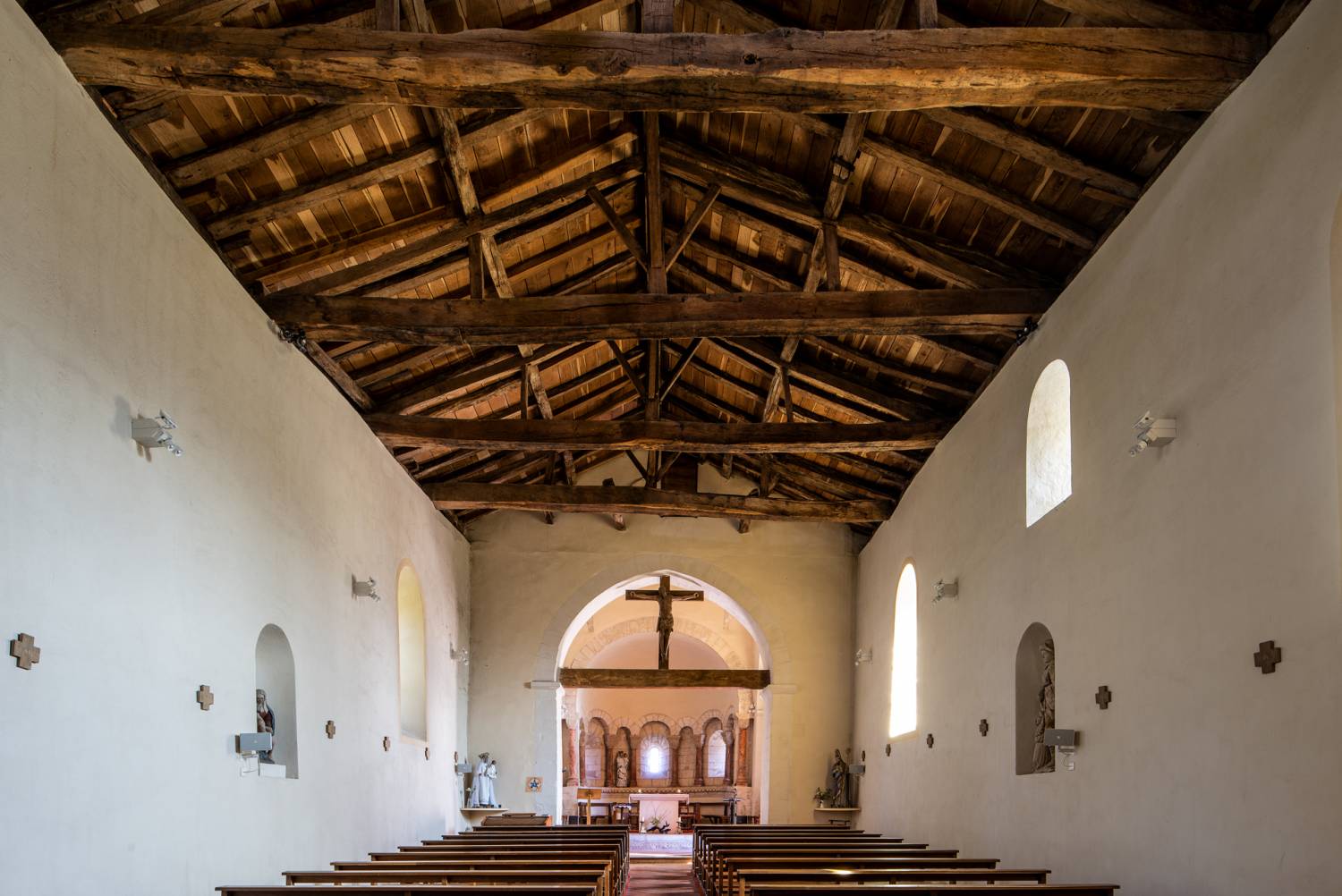 La nef romane, de 16,70 m de long sur 7,40 m de large, maintenant plafonnée, ne fut couverte, jusqu’en 1836, que d’une simple toiture à charpente apparente. Les anciennes fenêtres romanes, très étroites et haut placées, ont été murées à une date relativement récente au profit de baies plus larges (on voit très bien ces anciennes fenêtres à l’extérieur, dans le mur sud). Sur la nef s’ouvrait, au sud, une chapelle latérale, maintenant détruite, mais dont on voit encore à l’extérieur l’arc muré. Elle appartenait au seigneur de La Teyssonnière qui l’avait fondée, sous le vocable de Sainte-Catherine, vers le XVe siècle.