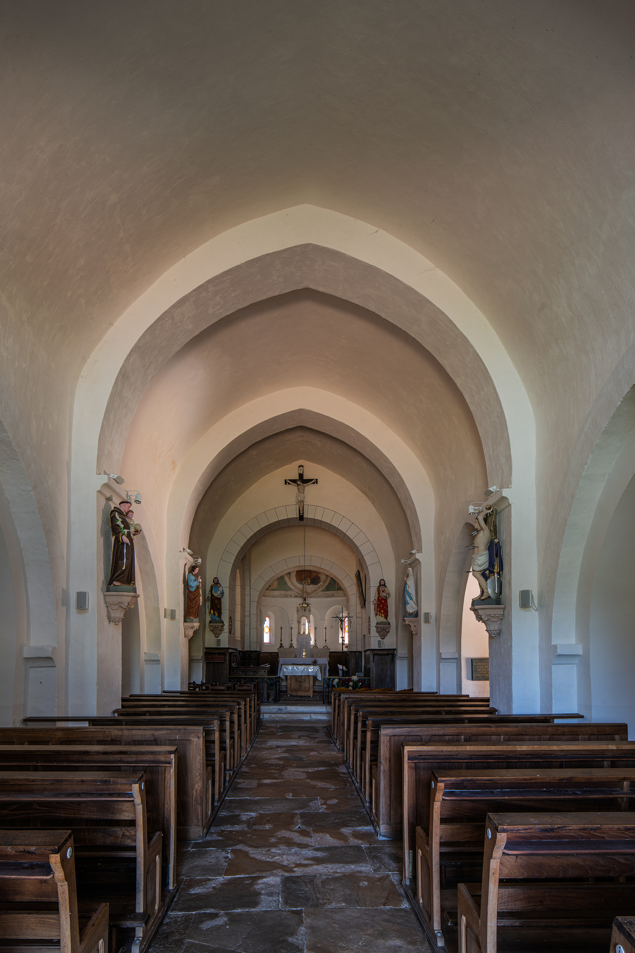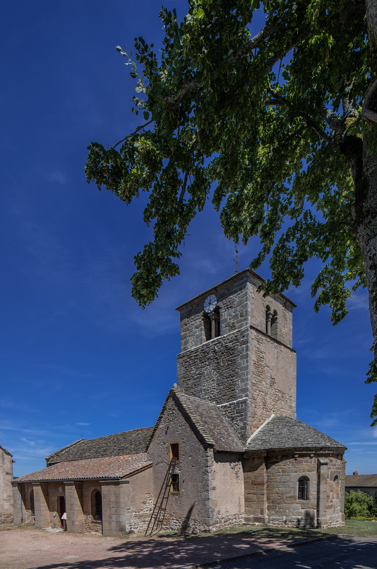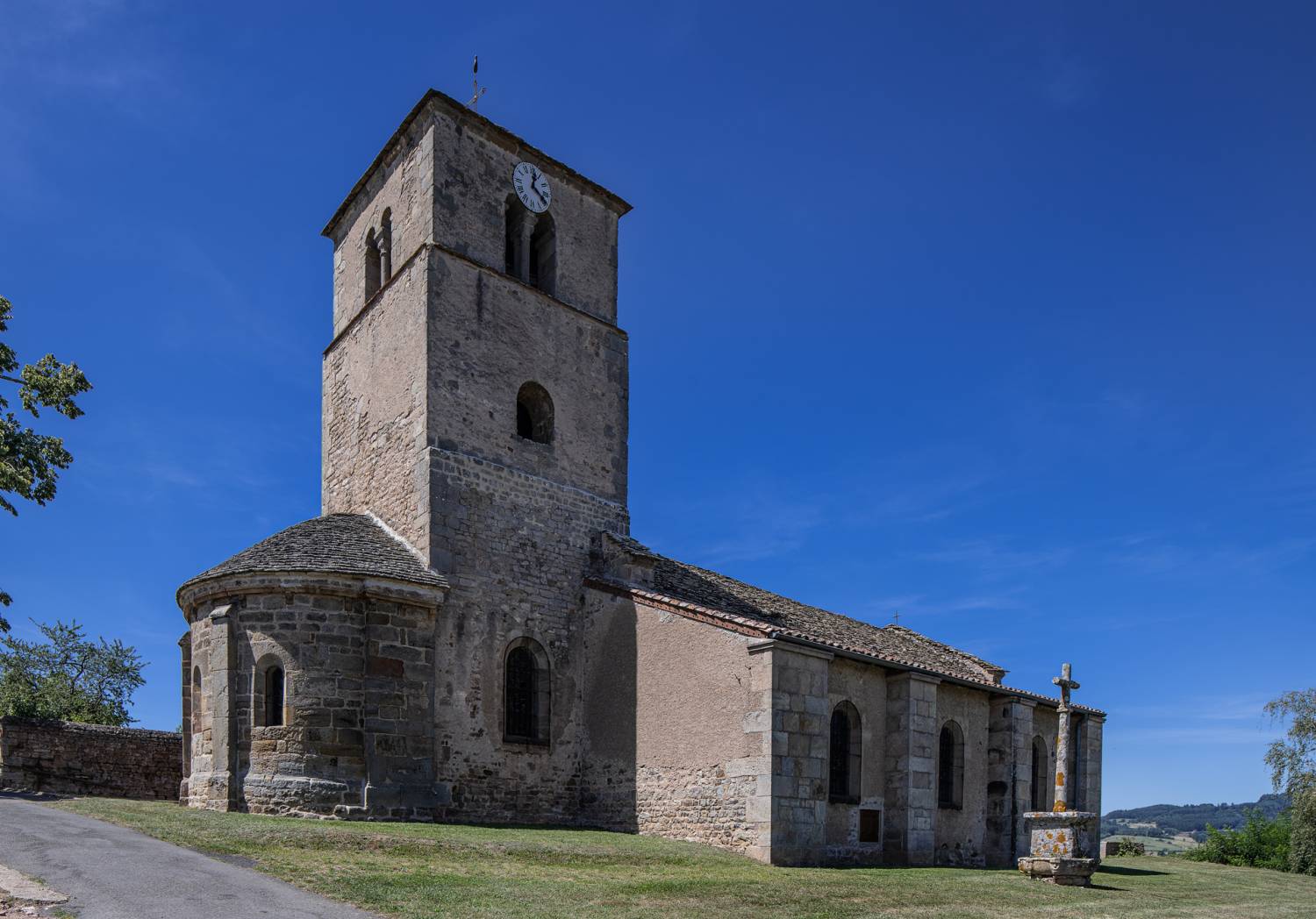 Entièrement voûté, l’édifice présente des dispositions très habituelles dans les édifices romans du XIIe s. en Clunisois : voûtes en berceau brisé sur doubleaux pour la nef ; coupole octogonale aux arêtes très peu soulignées, reposant sur quatre arcs en plein cintre et sur quatre trompes dans la travée sous le clocher ; abside en cul-de-four, profilé lui-même en plein cintre. Les collatéraux, ajoutés au milieu du XIXe s. sous la direction de l’architecte André Berthier, sont voûtés en berceau brisé ; ils communiquent avec le vaisseau central par des arcades au profil brisé, percées adroitement dans les murs romans sous les arcs formerets. Hormis les ajouts du XIXe s. déjà cités, l’on peut reconnaître comme modification de la même période, la création d’un triplet, en place et lieu d’une probable fenêtre axiale dans la façade occidentale, et d’une baie s’ouvrant sur la façade nord de la travée du clocher. À l’époque gothique, remontent peut-être l’édification de la chapelle accolée à cette même travée, cette fois-ci au sud, et celle de deux contreforts d’angles disposés en biais de part et d’autre de la façade occidentale. Les dispositions de la travée occidentale de la nef montrent que seul le côté sud était muni de fenêtres, le côté nord étant aveugle, comme c’est souvent le cas dans de nombreux édifices romans de la Bourgogne du sud.