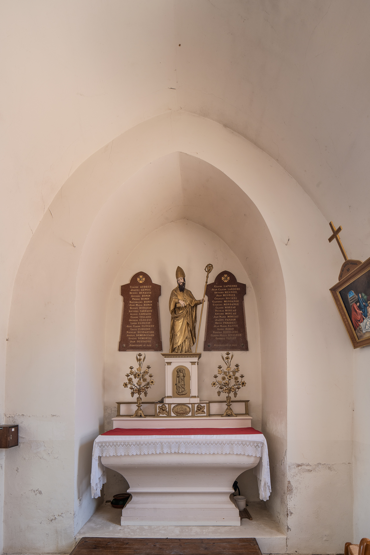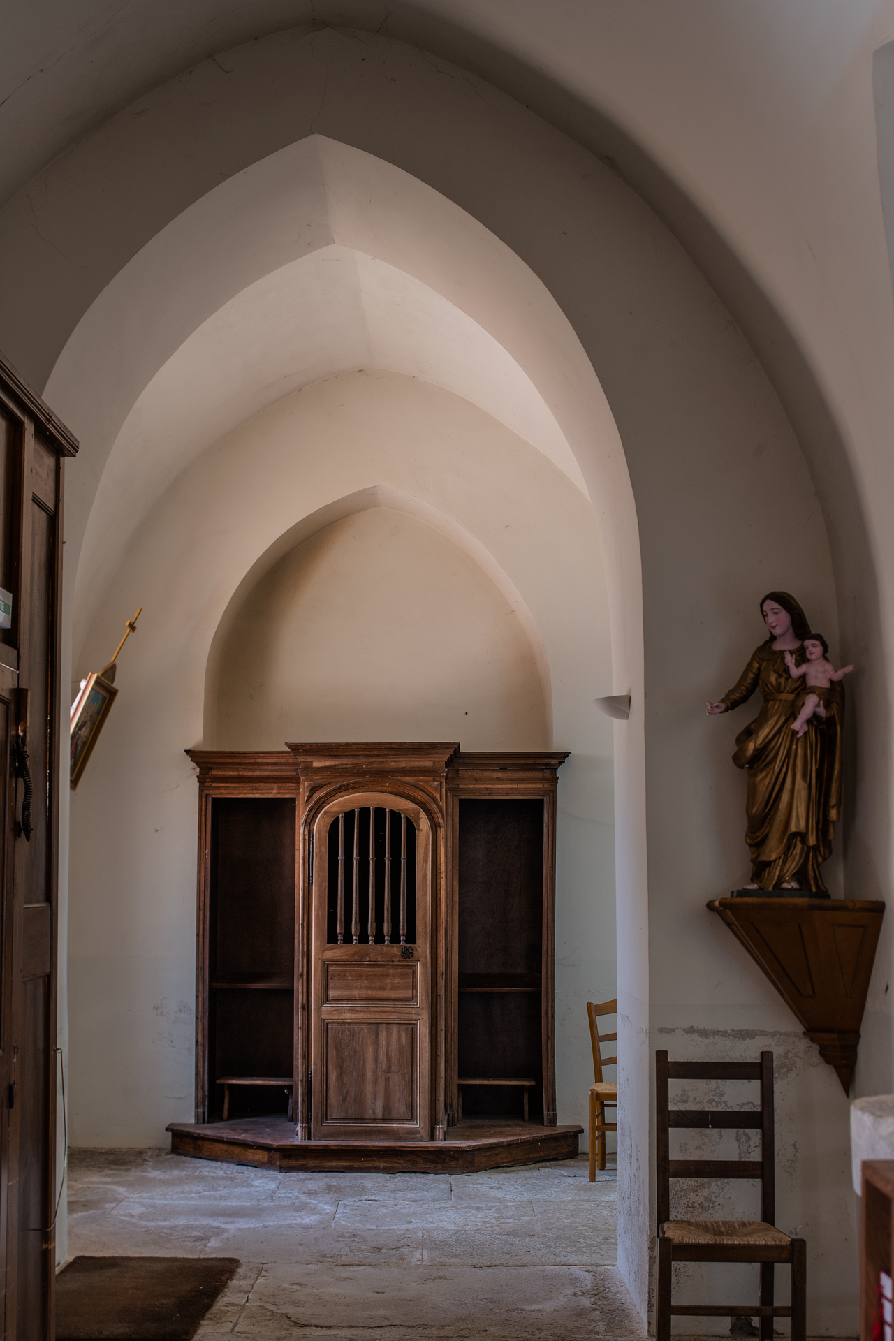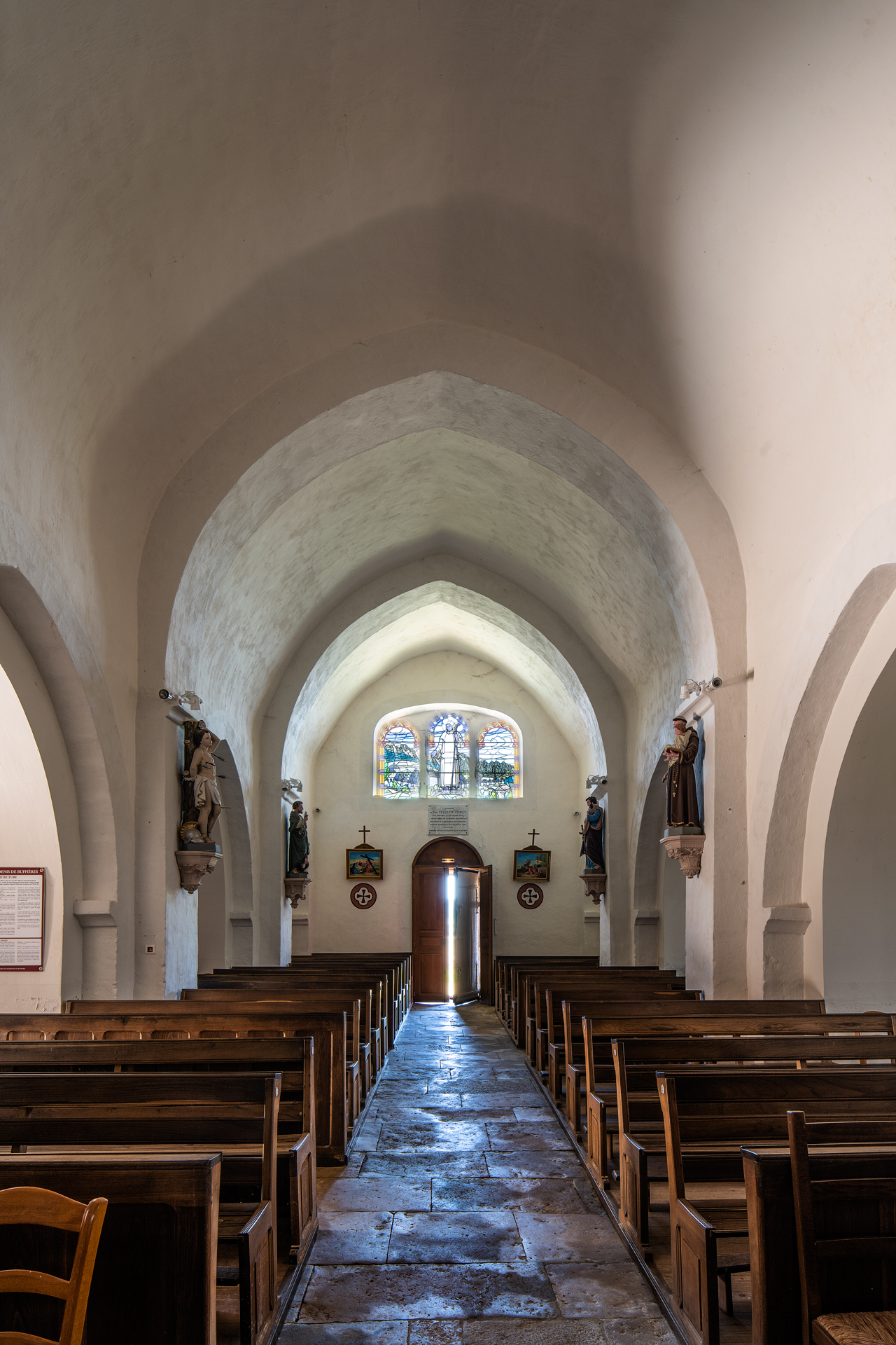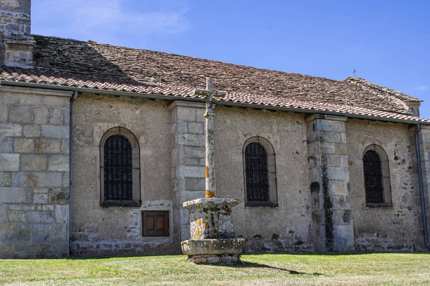 Entièrement voûté, l’édifice présente des dispositions très habituelles dans les édifices romans du XIIe s. en Clunisois : voûtes en berceau brisé sur doubleaux pour la nef ; coupole octogonale aux arêtes très peu soulignées, reposant sur quatre arcs en plein cintre et sur quatre trompes dans la travée sous le clocher ; abside en cul-de-four, profilé lui-même en plein cintre. Les collatéraux, ajoutés au milieu du XIXe s. sous la direction de l’architecte André Berthier, sont voûtés en berceau brisé ; ils communiquent avec le vaisseau central par des arcades au profil brisé, percées adroitement dans les murs romans sous les arcs formerets. Hormis les ajouts du XIXe s. déjà cités, l’on peut reconnaître comme modification de la même période, la création d’un triplet, en place et lieu d’une probable fenêtre axiale dans la façade occidentale, et d’une baie s’ouvrant sur la façade nord de la travée du clocher. À l’époque gothique, remontent peut-être l’édification de la chapelle accolée à cette même travée, cette fois-ci au sud, et celle de deux contreforts d’angles disposés en biais de part et d’autre de la façade occidentale. Les dispositions de la travée occidentale de la nef montrent que seul le côté sud était muni de fenêtres, le côté nord étant aveugle, comme c’est souvent le cas dans de nombreux édifices romans de la Bourgogne du sud.