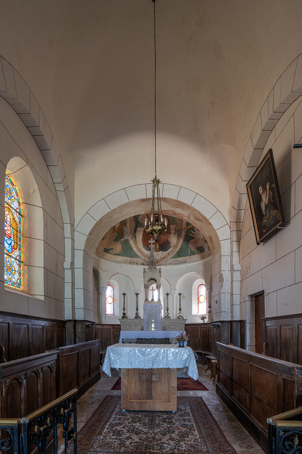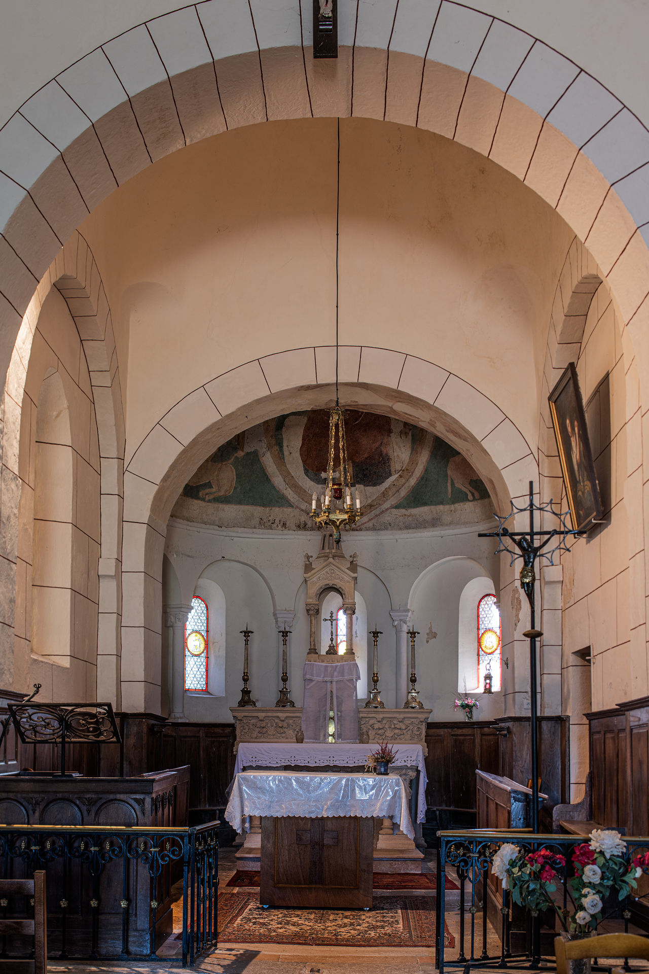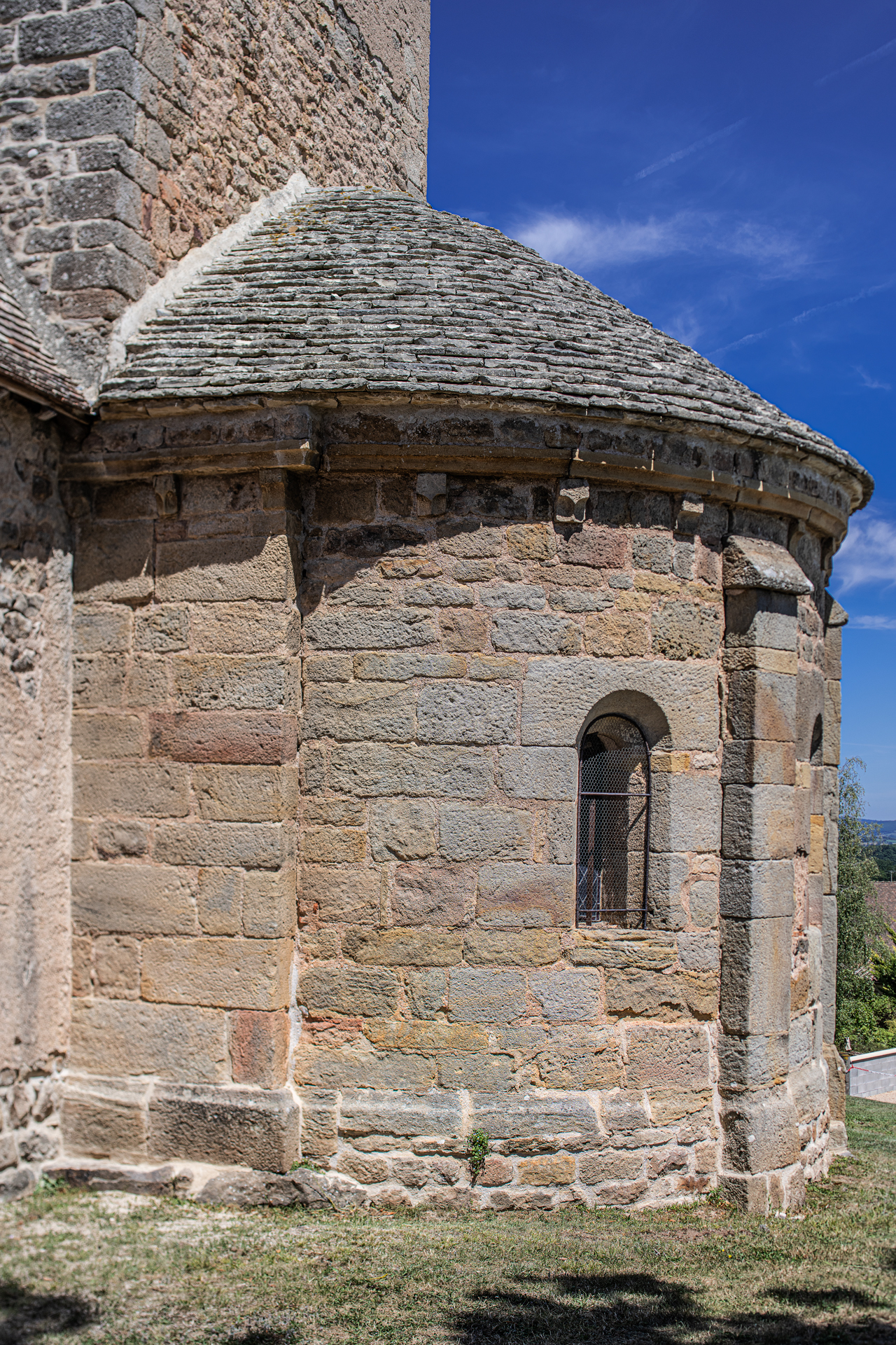L’abside a conservé la quasi-totalité de ses dispositions, hormis deux des trois baies en plein cintre ; les fenêtres latérales ont été élargies par la rectification de leurs ébrasements pour apporter davantage de lumière. Elle est la seule, avec le clocher, à posséder un décor sculpté. Une arcature orne sa paroi intérieure : ses cinq arcs en plein cintre reposant sur quatre colonnettes s’appuient latéralement sur des pilastres sculptés. Le décor des pilastres est composé de cannelures et de tresses obliques, aux réserves pourvues d’un bouton floral et de rangées de carrés posés sur la pointe. Les corbeilles des chapiteaux s’ornent de feuilles simples dont certaines s’épanouissent en plusieurs lobes ou en thyrse. Les bases sont attiques ou parées de larges feuilles. Le répertoire de cette sculpture est tiré directement des modèles clunisiens, dont l’église tout entière semble avoir subi l’influence. Le cul-de-four de l’abside, délimité à sa base par une corniche, est orné de peintures murales. Deux campagnes sont actuellement décelables grâce aux travaux de dégagement opérés récemment. Un décor roman, au thème bien connu du Christ en gloire entouré des quatre symboles des évangélistes, a été repris ultérieurement.