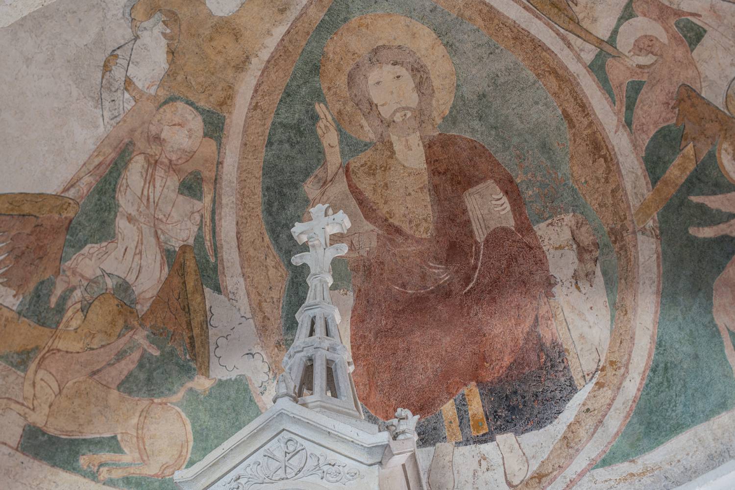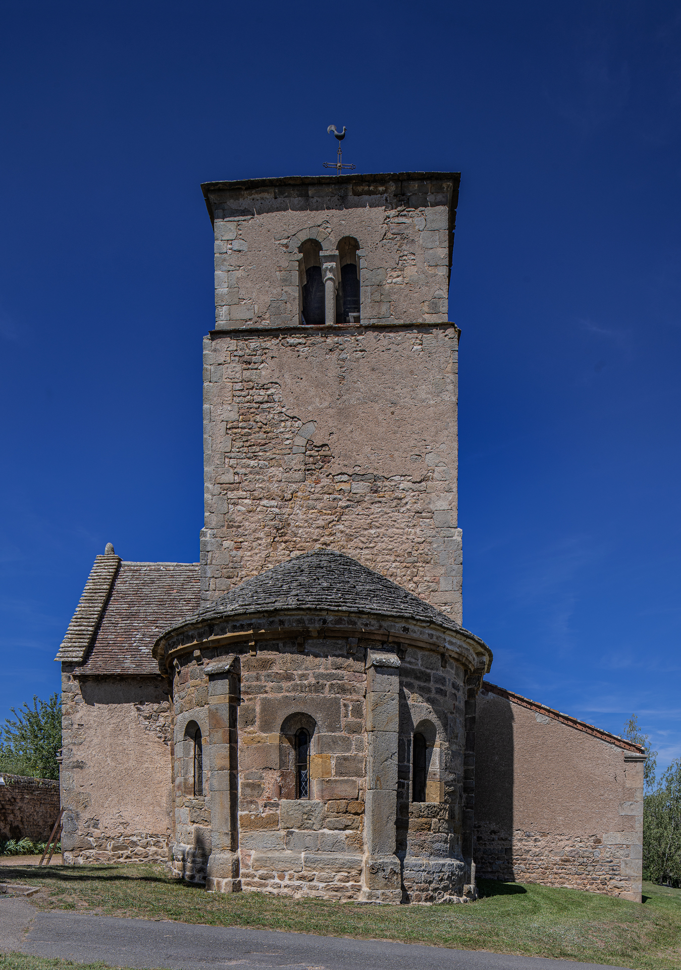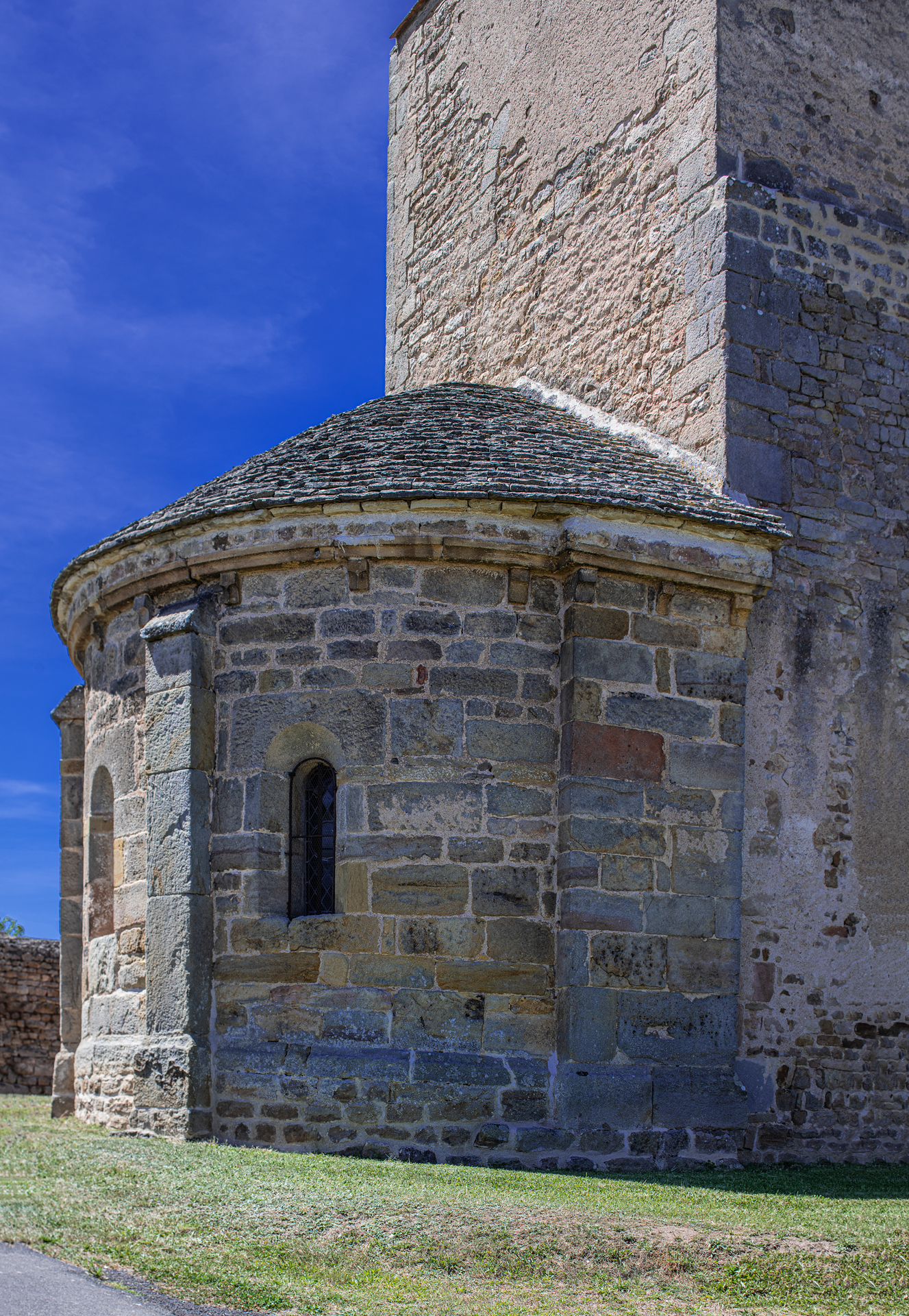 L’abside a conservé la quasi-totalité de ses dispositions, hormis deux des trois baies en plein cintre ; les fenêtres latérales ont été élargies par la rectification de leurs ébrasements pour apporter davantage de lumière. Elle est la seule, avec le clocher, à posséder un décor sculpté. Une arcature orne sa paroi intérieure : ses cinq arcs en plein cintre reposant sur quatre colonnettes s’appuient latéralement sur des pilastres sculptés. Le décor des pilastres est composé de cannelures et de tresses obliques, aux réserves pourvues d’un bouton floral et de rangées de carrés posés sur la pointe. Les corbeilles des chapiteaux s’ornent de feuilles simples dont certaines s’épanouissent en plusieurs lobes ou en thyrse. Les bases sont attiques ou parées de larges feuilles. Le répertoire de cette sculpture est tiré directement des modèles clunisiens, dont l’église tout entière semble avoir subi l’influence. Le cul-de-four de l’abside, délimité à sa base par une corniche, est orné de peintures murales. Deux campagnes sont actuellement décelables grâce aux travaux de dégagement opérés récemment. Un décor roman, au thème bien connu du Christ en gloire entouré des quatre symboles des évangélistes, a été repris ultérieurement.