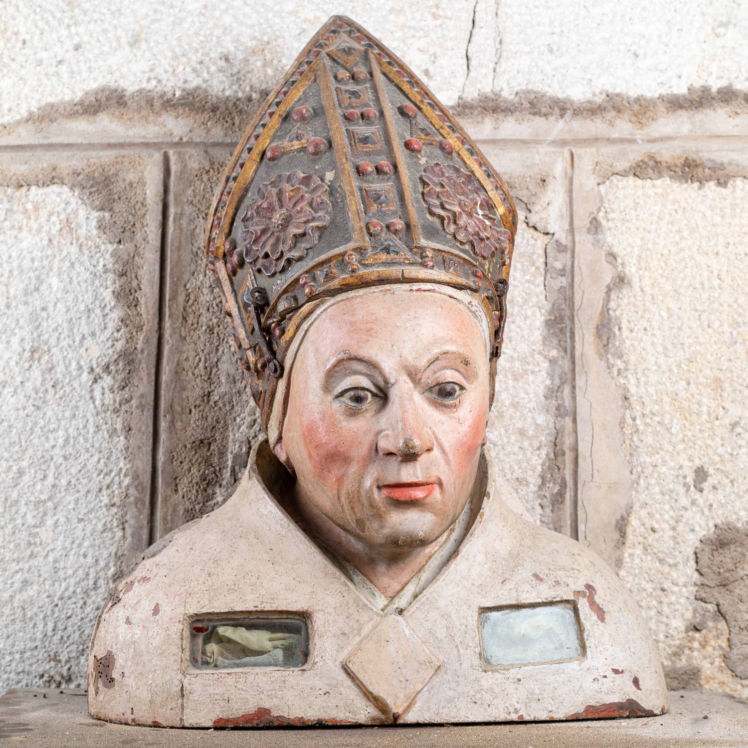 L’abbé Lacreuze, dans la note qu’il consacre au reliquaire disparu de saint Firmin dans les Mémoires de la Société Eduenne, date cet objet du XVIIIe siècle. Cette datation ne résiste pas à son examen qui ne peut que conclure à une plus grande ancienneté, grâce, en particulier, aux détails vestimentaires, tels la mitre, ornée d’orfrois et pierreries, ou la chape pourvue de deux logettes à reliques au niveau des épaules. Le réalisme du visage conforte la proposition du XVe siècle pour sa réalisation. A l’arrière du crâne, une charnière permet le basculement de la mitre et l’accès à une cavité contenant un fragment de la calotte crânienne du saint. Il est probable que la commande et la réalisation de cette sculpture ont accompagné celles de la châsse décrite par l’abbé Lacreuze. On peut établir un parallèle entre le traitement des reliques de saint Firmin et celui des restes de saint Lazare, à la cathédrale voisine d’aucun où le « chef » du ressuscité de Béthanie avait été installé dans la reliquaire spécial. Le terminus de 1488, donné par l’enquête du notaire Jean d’Aiguemorte, chargé par Antoine de Chalon, évêque d’Autun, d’enquêter sur le nombre et la réalité des miracles opérés au reliquaire de saint Firmin, vaut certainement aussi pour le buste-reliquaire.
