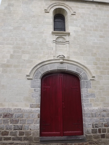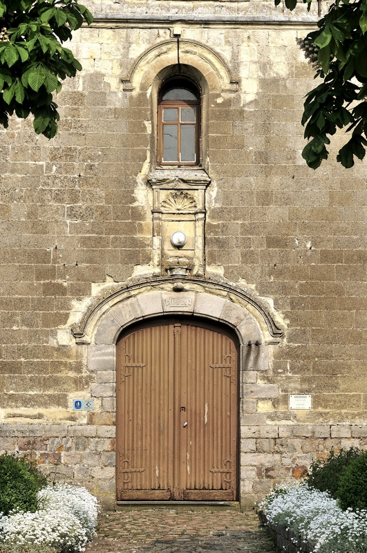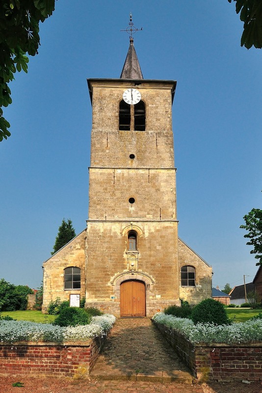 La tour carrée qui s’élève à l’ouest est la partie la plus ancienne de l’édifice, relevé à la suite de l’incendie causé en 1555 par les troupes françaises qui assiégeaient Cambrai. La date de 1579 figure au-dessus de l’entrée, sous une petite niche à coquille, dans un cartouche rectangulaire taillé dans l’encadrement de la porte en anse de panier, fait dans la pierre dure du Hainaut, de tonalité bleu foncé.