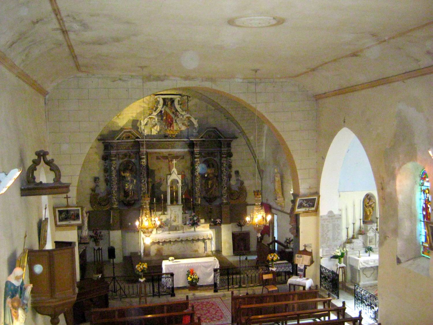 La nef de église se compose d’une avant-nef où deux baptistaires en pierre sont disposés de part et d’autre du portail. Cet espace est surmonté d’une tribune soutenue par des colonnes en bois avec des chapiteaux ioniques. L’ensemble de la nef est plafonnée par une voûte surbaissée en lattis. Quelques statuaires et une chaire en bois ornent les murs de la nef, style fin XVIIIe siècle. On remarque en son centre, une rosace à palmettes, décor spécifique du Ier Empire. Les angles supérieurs du plafond sont arrondis et soulignés par une double baguette de couleur jaune qui constitue, avec la rosace, le seul décor de cette nef.