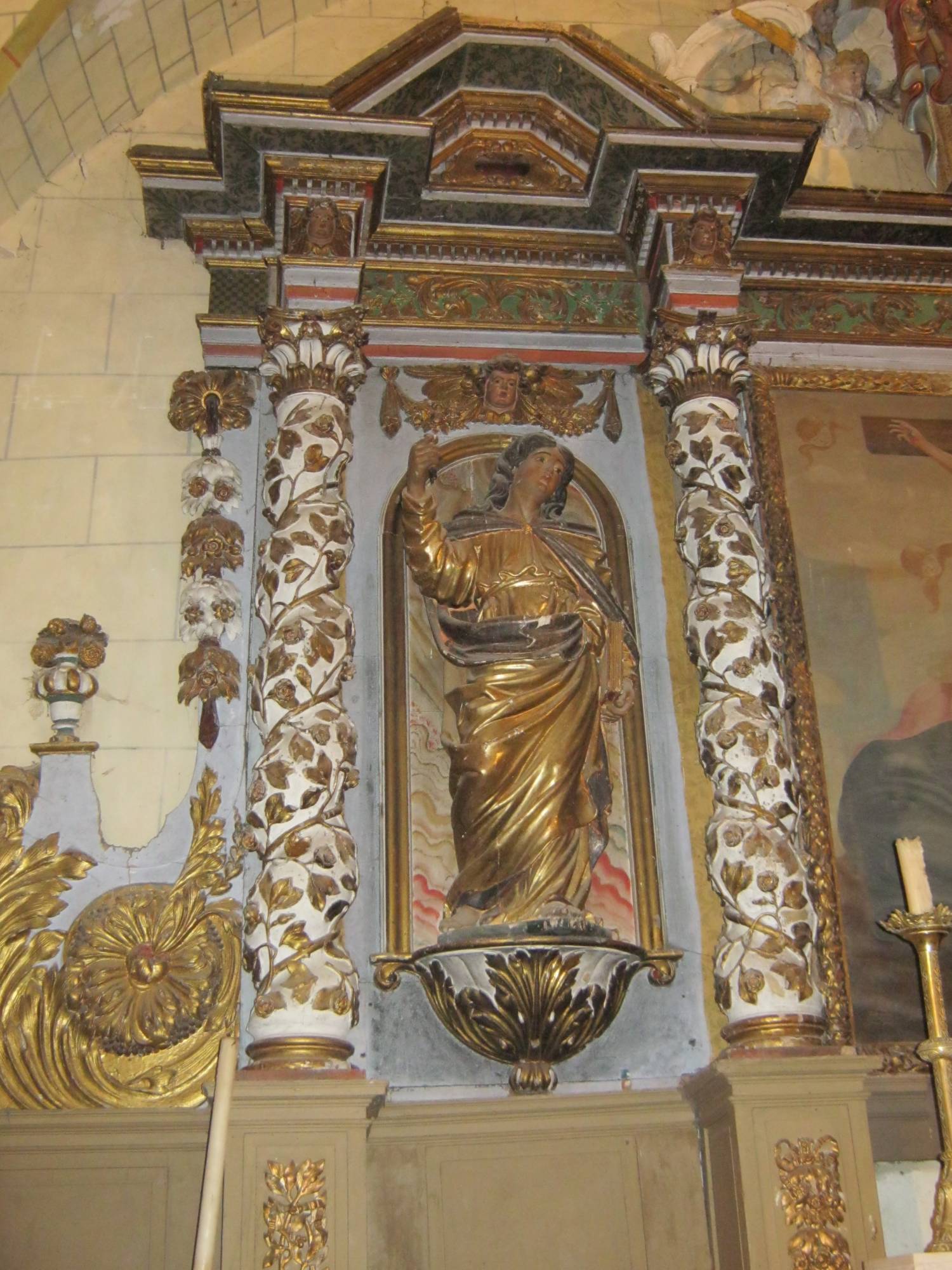 Le maître autel est en marbre blanc des Pyrénées, avec gradins, tabernacle et expositoire. Il comporte un retable en forme de triptyque. Le panneau central est orné d’un tableau peint, les volets latéraux sont bordés de colonnes torses garnies de pampres et abritent les statues de saint Just et saint Pasteur dans des encadrements symbolisant des niches. Le fond de ces dernières est peint en faux marbre. De larges volutes dorées avec motifs végétaux ornent les deux cotés.