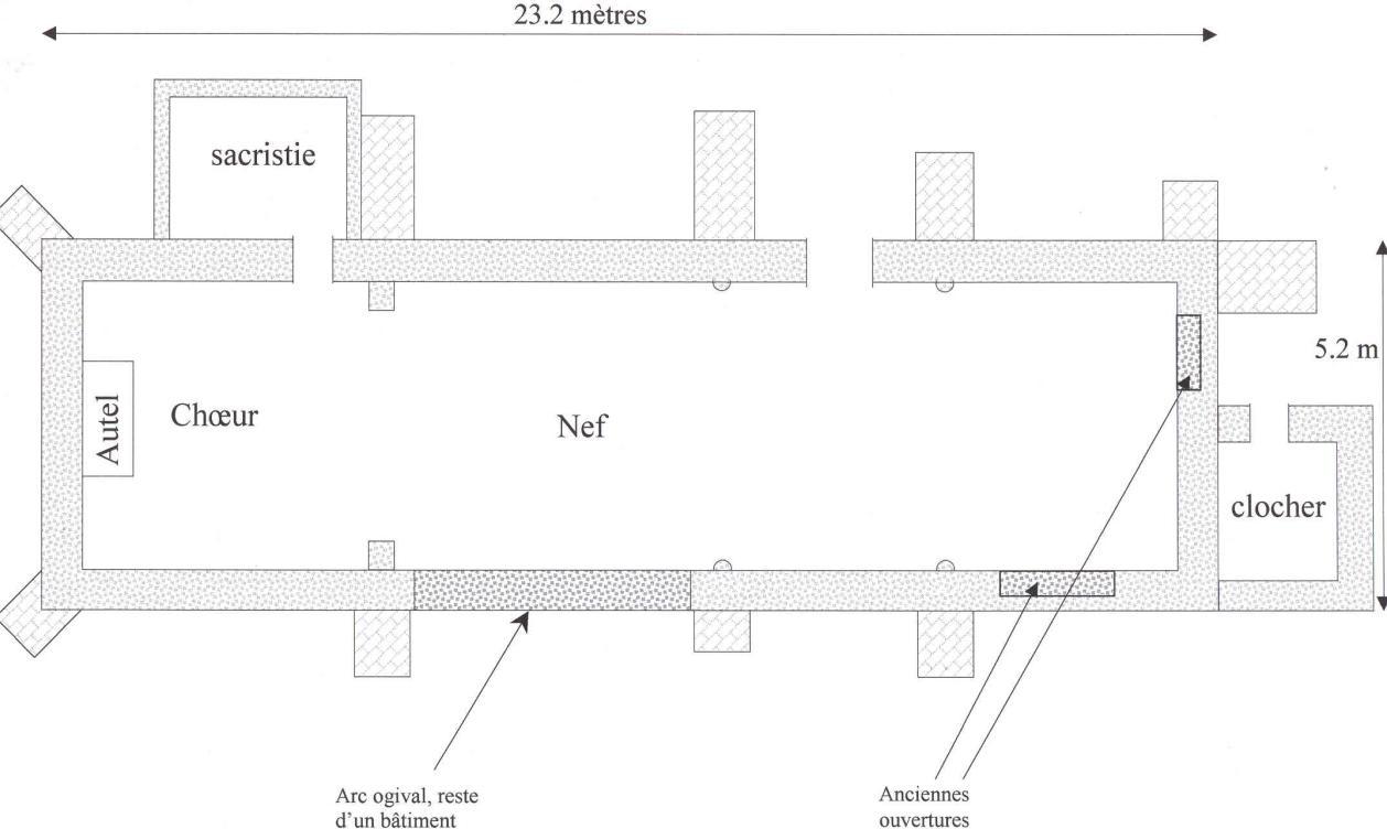 Au nord, au niveau du chevet apparaît la trace d’une porte rectangulaire murée qui avait été aménagée à l’intérieur d’une grande arcade elle-même obturée. Là, se trouvait, peut-être le « beau antiporge sive proumenoir bien basti de pierre et couvert », un auvent ou promenoir, évoqué dans l’enquête diocésaine de 1547.