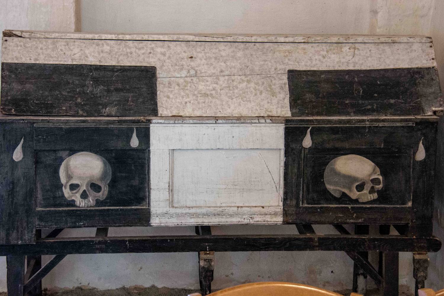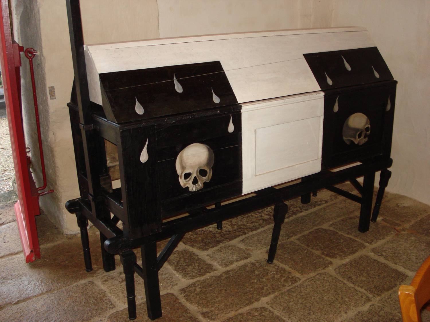 L’usage de ce type de catafalque n’est attesté que dans quelques régions de France, en Isère, dans les Alpes, et bien entendu en Bretagne, avec des formes variées, certes, mais des pratiques semblables. Réalisé au XIXe siècle, l’objet avait, tout comme nombre de ses prédécesseurs, l’insigne tâche d’accueillir le cercueil de nos disparus ou de symboliser leur présence lors de certaines cérémonies liturgiques. L’objet, sobrement paré de noir, est rehaussé d’une large croix blanche peinte en son sommet et s’étendant sur ses flancs. Les panneaux des bas-côtés sont traditionnellement décorés de têtes de mort et de larmes, ces dernières rappelant les lamentations et les thrènes qui accompagnaient alors le cortège funéraire.