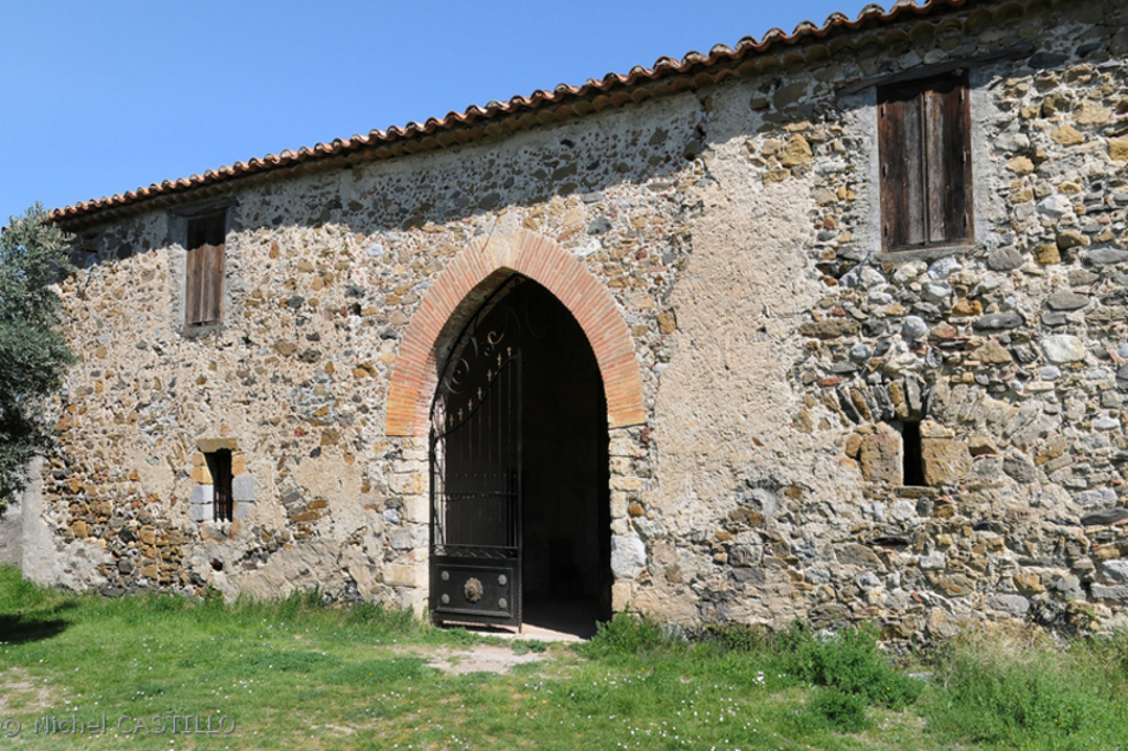 L’entrée se fait par un portail monumental dit Nostra-Damo-de-Douno-Pa (Notre-Dame de Donne Pain), constitué d’un arc plein cintre en grès supporté par deux colonnes à chapiteaux et bases sculptées. Ces pierres, d’après leurs sculptures, pourraient dater du Xe siècle et proviennent vraisemblablement de la première chapelle détruite. Le porche semble être plus tardif.